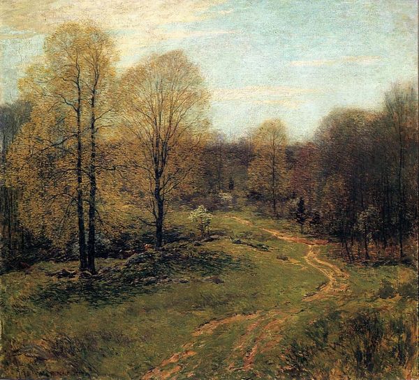 Curator: Here we have "The Sere and Yellow Leaf", an oil painting, presumably by John Atkinson Grimshaw. Looking at it, I get this immense sense of…melancholy? It’s muted, golden, like looking through aged glass. Editor: Precisely! It's like peering into a memory, a beautiful but fading one. Yellow, the color of intellect and decay, dominating the scene, as it is full autumn. Grimshaw captures this liminal time—between vibrant life and stark dormancy. Notice the subtle ways in which light and shadow play—symbols for transition itself. Curator: Absolutely. I see it now. The winding road practically beckons us into the scene. And what about that imposing house in the background, barely visible through the bare trees? Is that supposed to mean something to us, psychologically? Editor: Oh, certainly. The house can symbolize several things depending on the context: stability, the self, or a life left behind. Here, veiled in autumnal haze, it's both inviting and distant, which really hits the mark in terms of nostalgic longing. The decaying leaves underfoot evoke a journey into our past selves—like a passage of memory or even a kind of spiritual test! Curator: Hmm… test? I mostly get quiet reflection from that wall which is going away from us, and fading away the landscape scene ahead. So it´s not the journey, but the memories while doing the journey instead. You can almost smell the damp earth and hear the rustling leaves. Editor: Yes, and the composition steers our eye forward, deeper into the symbolic maze—I mean, pathway—while our feet remain symbolically planted by the yellow leaves: nostalgia in the real. But the romantic spirit doesn’t always have to mean drama, it may also represent what it means to find yourself from reflection through past times and familiar symbology. Curator: In many ways. This image really feels intimate. Like discovering someone's private, and treasured—thought. Editor: And maybe in some ways a beautiful epitaph for autumn!