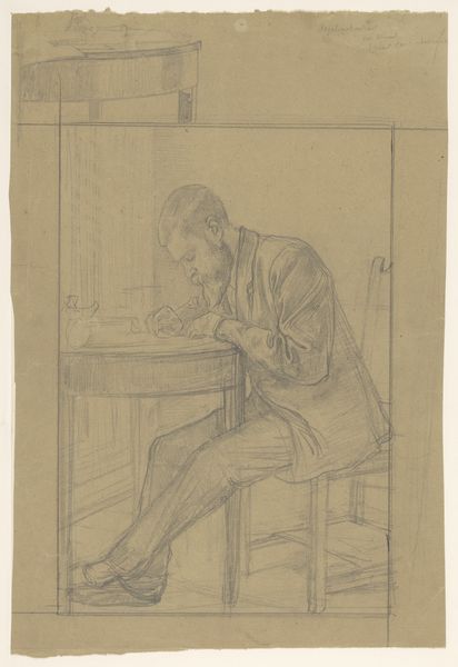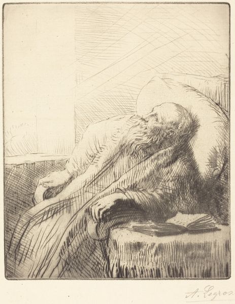 Editor: So, this is George Elbert Burr’s "The Etcher," circa 1925. It's a graphic art print, an etching actually, and the image feels very intimate, almost like we're peeking into a private moment. What strikes you most about it? Curator: The immediate thing that grabs my attention is the profound visual vocabulary inherent in the act of creation itself. Etching is more than a craft; it’s an alchemy, transforming base metals into enduring images. Consider the hand, the etcher's primary tool. The hand that guides the needle, it's a symbol for human ingenuity. Do you see how it mimics the lines and furrows of the etched plate? Editor: Yes, I do! It's like the artist is drawing attention to the hand as *the* essential instrument, the origin point of art making. Curator: Precisely! This work asks, where does creativity originate? Within us or from some outside force? Note, too, the solitary figure and the seemingly concealed etching, they invite contemplation on the emotional and psychological space where artists transform perception into tangible form. How does this image contribute to our perception of “the artist”? Editor: I hadn't thought of it that way before, but this makes the artist seem much more vulnerable and human than just an untouchable figure. I see a focused artisan pouring effort into his creation. I guess I initially just took the imagery for granted without digging beneath it! Curator: Often, we glaze over symbols. This exercise hopefully helps to unearth them.