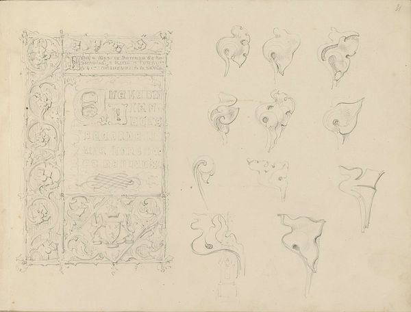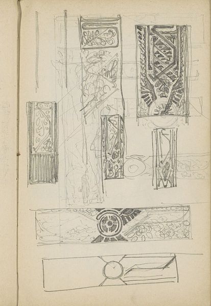 Editor: This is "Architectonische details uit de Warmoesstraat," a pencil drawing on toned paper created in 1862 by Isaac Gosschalk. It's intriguing; a whole collection of architectural elements laid out like puzzle pieces. What do you notice first when you look at the arrangement of these sketches? Curator: Initially, the composition presents itself as a field for studying forms. Notice how the artist's choice of toned paper interacts with the graphite to model shape, volume and space within each isolated architectural element. It also serves to unify what would otherwise be discrete studies on the page. Editor: It almost seems like the objects float, because the sketch itself doesn't commit to any particular grounding. There is shading but the tonal gradations vary for each individual element. Can we decode some significance out of these particular architectural "details?" Curator: The sketch's semantic content directs us to look deeper at how we distinguish the image as a constructed surface of formal operations. The interplay between the represented objects and their representation creates an opening to engage with the work's intended viewing position and what constitutes "architecture" for the artist. This tension between subject and execution ultimately makes the drawing compelling. Editor: So, less about the specific details themselves, and more about how they're presented as studies of form and the very act of sketching, right? I see now how that emphasis on the medium reshapes my focus. Thanks! Curator: Precisely. By deconstructing our initial expectation, the sketch prompts reflection upon what drawing enables the artist and viewer to see.