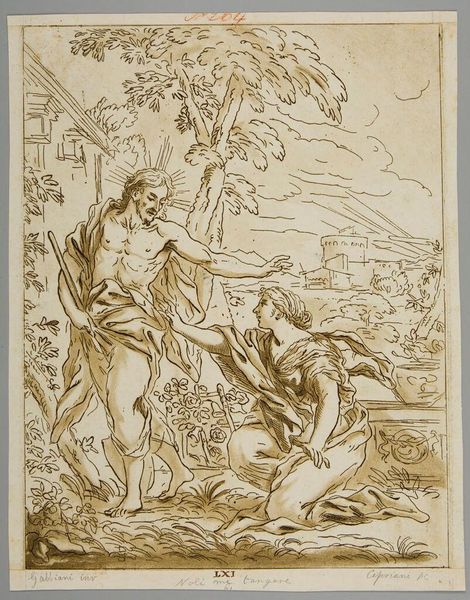 Curator: This is "Guardian Angel" by Jonas Umbach, who lived from 1624 to 1693. What stands out to you? Editor: The etching feels quite turbulent, with dense lines giving it a dramatic, almost anxious atmosphere. Curator: Yes, and the process of etching itself—the labor involved in creating these lines—contributes to that feeling. Think about the repeated action of applying acid resist and scratching the image. Editor: Considering the religious context of the time, could it reflect anxieties about faith or divine intervention amidst social upheavals? Curator: Perhaps. The availability of prints also meant religious imagery was becoming more accessible, a commodity really. Editor: It's a powerful reminder of how art is both a product of its time and a tool for shaping it. Curator: Indeed, a dialogue between the sacred and the societal.