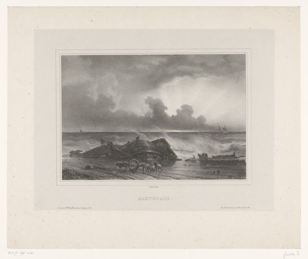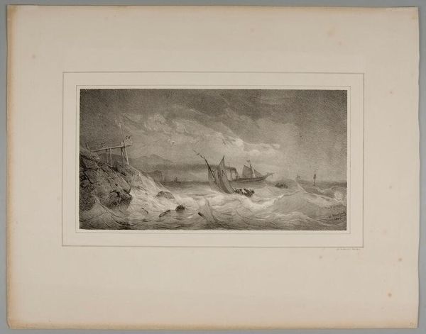 Editor: Here we have Alexandre Calame's "Landscape Number 31." It's…well, it's rather dramatic, isn't it? Turbulent sea, brooding sky. What do you see in this piece? Curator: Drama indeed! I see a soul wrestling with the sublime. Calame, bless his heart, was trying to capture the untamable spirit of nature, but maybe also, a glimpse of his own inner storms, don't you think? The tiny figures in the boat are almost comical. Editor: Comical? Curator: Yes! Like tiny ants daring to challenge a very angry giant. It's a reminder, perhaps, that even in the face of overwhelming power, there's a certain…stubbornness to the human spirit. Editor: I see that now! The small boat adds to the big contrast. Curator: Precisely! Calame's work is a fun mirror reflecting the eternal dance between our ambition and nature's raw power. Editor: I never thought of it that way! Thanks for opening my eyes.