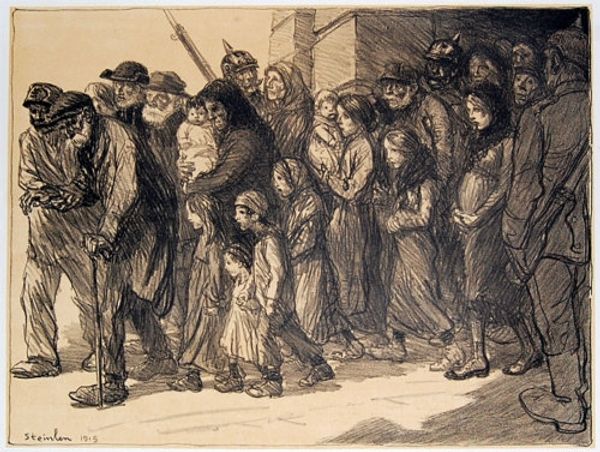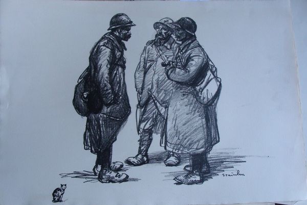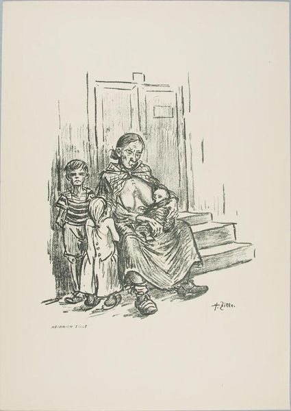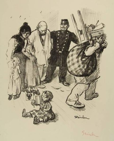 Curator: Steinlen's "Sans Famille," created in 1916, uses primarily pencil to capture a poignant moment during a time of conflict. The work offers an interesting commentary on displacement and human interaction. Editor: It’s heartbreaking, isn’t it? The loose pencil work almost dissolves the figures into shadows. They seem weary, almost ghosts moving across the page, clinging to each other. Curator: Indeed. The medium of pencil itself feels particularly resonant here. It's easily accessible, inexpensive, perfectly suited to documenting the realities of everyday life amidst wartime constraints. Editor: It's like he’s snatched a quick glimpse – a fleeting record of a life interrupted. Look at the way the lines almost vibrate with the tension in the scene. That soldier detached from the group on the right... you can almost feel the weight of what he carries. Curator: And it is important to acknowledge how Steinlen, as an established artist, utilizes the readily available tools of drawing to highlight the impact of war on civilians, pushing the boundaries of what 'high art' should address. The composition, the grouping, encourages us to think about social structure, family, and how they are reshaped by larger forces. Editor: Right. And that title, “Sans Famille” – Without Family. It's like a gut punch. So much loss suggested, but also resilience, clinging to one another when everything else has been taken away. There's a tender protection in the way the woman holds her child, you know? Curator: The very texture of the drawing contributes. Notice how the rough strokes of the pencil suggest not only movement, but also the gritty realities of their existence, devoid of comfort, reduced to the bare necessities. Editor: Absolutely. There is a beauty, an unexpected, delicate sort, amidst all that. It feels so incredibly, palpably human. It’s in the tilt of a head, the slump of a shoulder – he really caught the nuances of despair and survival, didn't he? Curator: He used simple materials to showcase that human resilience, inviting the audience to see those commonly affected and consider broader social inequalities in that historical context. Editor: It’s stayed with me – those delicate, fierce lines capturing such raw emotion. Thank you.