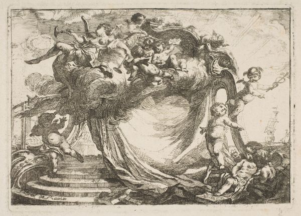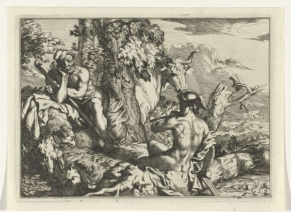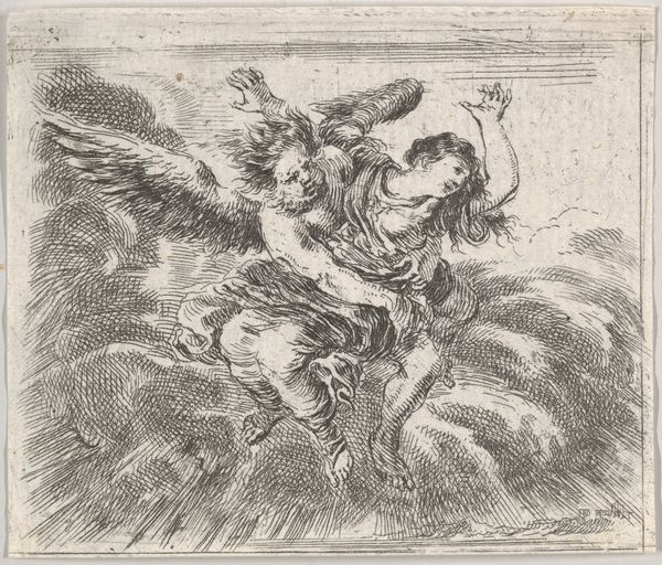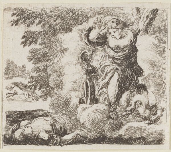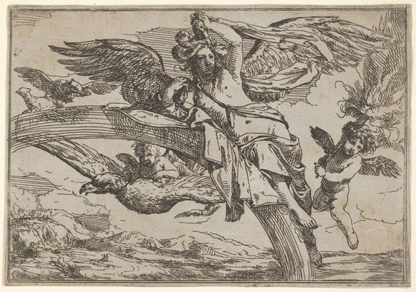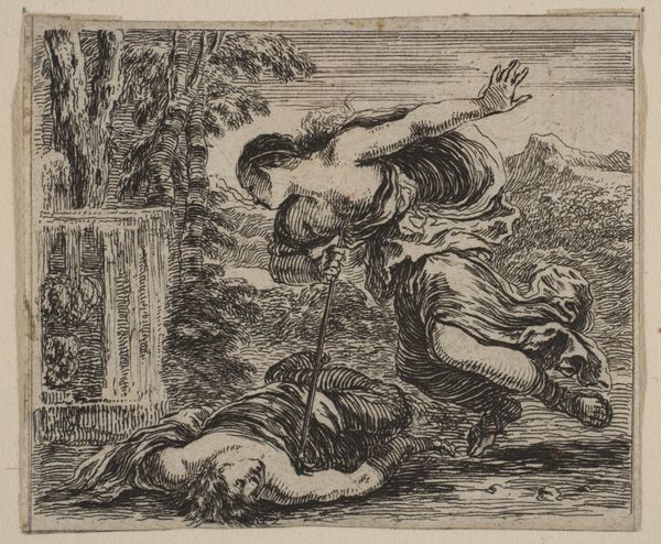 Editor: This is Gerard de Lairesse’s “Mercury with the Head of Argus,” made around 1670 in ink and engraving. It has a dramatic, almost operatic feel to it, despite being a fairly small drawing. What catches your eye when you look at it? Curator: Oh, absolutely operatic! And slightly bonkers, wouldn’t you say? Lairesse really knew how to stage a scene. The dramatic lighting, that swooping figure of Mercury, sword in one hand, Argus's freshly severed head in the other...it’s like Caravaggio directing a puppet show. But what I really love is how he handles the landscape; it is as theatrical as the main event, isn't it? Like a backdrop threatening to swallow everything. What do you make of that severed head, nonchalantly displayed? Editor: It's definitely... striking. Gruesome, but also like a prop, as you say. Does the landscape have symbolic value, beyond being dramatic? Curator: I think it's both stage and symbol. Baroque art loves a bit of moralizing, doesn't it? The untamed landscape, the fall of Argus – perhaps a comment on the dangers of unchecked power, or the seductive deceitfulness of appearances, brought by Mercury’s cunning? He wasn't exactly forthright about his intentions toward Argus, was he? But then, is anything in art straightforward? It also reveals what happens if we fail at our duties. It is pretty profound for just a simple drawing. Editor: That makes a lot of sense. I was so focused on the figure, I almost missed that wider point. It is quite captivating when we put it that way. I think I need to spend some more time letting the whole scene sink in! Curator: Exactly! Let it simmer, let it surprise you. That's half the fun. Thanks for pointing out Lairesse, it made me look at this artwork under a new light too.