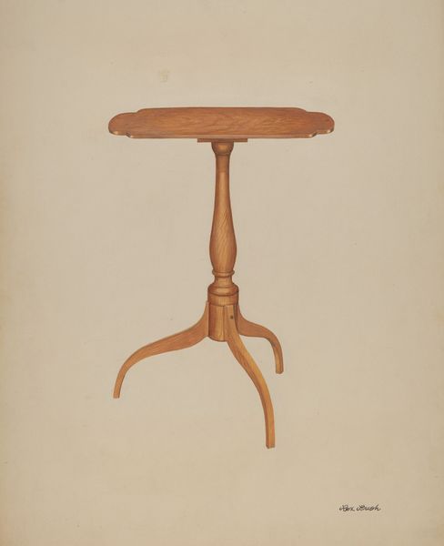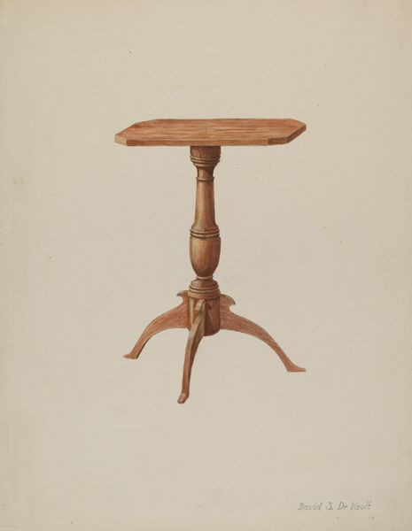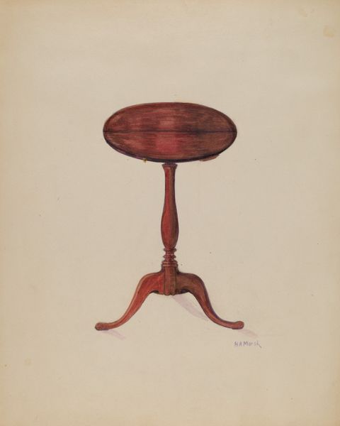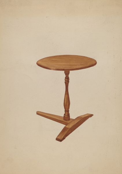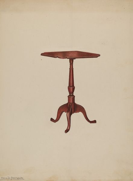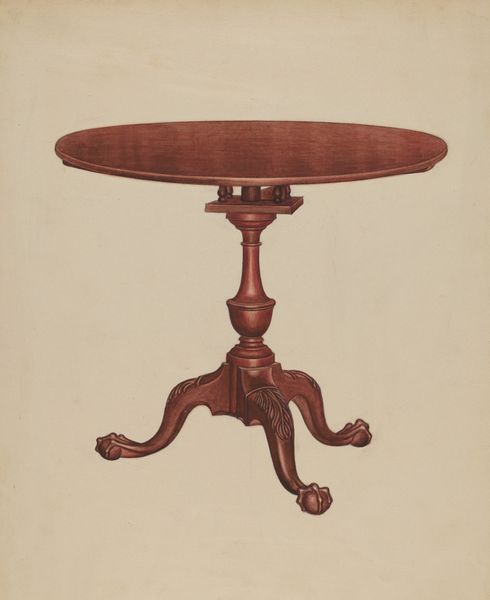 Editor: Here we have Ferdinand Cartier’s "Tilt Table" from around 1937, a drawing rendered in watercolor. It feels so meticulously observed, like a catalog entry, but something about its isolation gives it a quiet sort of dignity. How would you interpret this work? Curator: It's interesting you use the word 'dignity'. I see that, too. In its precise rendering, Cartier elevates what is essentially a functional object. Consider the social context of the 1930s. Mass production was becoming increasingly prevalent. Do you think Cartier might be subtly making a statement about craftsmanship and the value of individual design in an era increasingly dominated by industry? Editor: That’s a perspective I hadn't considered! It reframes it less as just a record, and more as an argument about design principles, almost. Do you think it would've been commissioned by the furniture maker? Curator: Possibly. Commissions like this were ways for artisans to document and promote their wares. However, viewed from today’s lens, Cartier's approach resists the anonymity inherent in mass-produced items, especially now as design elements become free and open source. It subtly advocates for an authorship, a distinct artistic voice in creation, pushing back on this concept that design should only follow function. What does its “realism” suggest to you? Editor: It makes me think that perhaps “realism” is more about truth of craft. It prompts me to re-evaluate the value of an individual creation against the background of design history, as it moves towards open source. Curator: Precisely. And understanding how such a seemingly simple image engages with those larger socio-political forces is crucial. Thanks to works like this, even everyday objects can speak volumes!