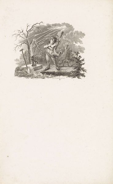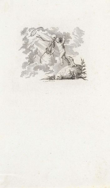 Reinier Vinkeles created this print of two putti with a burning heart sometime between 1741 and 1816. It suggests a number of ideas about love, risk, and innocence. We see two cherubic figures standing together, one holding a shield and spear, the other a flaming heart. They are surrounded by danger: a menacing reptile lurks on one side, while a snake slithers nearby. Made in the Netherlands, a land known for its mercantile power and complex social codes, this image may serve as a commentary on the perils of love in a world driven by commerce and social standing. The putti, symbols of purity, stand in contrast to the surrounding threats, perhaps suggesting the vulnerability of the heart in a society fraught with risk. Understanding the nuances of Dutch social history, particularly the role of symbolism in art and literature, could provide deeper insights into Vinkeles's work. We may turn to the cultural and intellectual context of the late 18th and early 19th centuries in the Netherlands to explore the print's intended meaning.