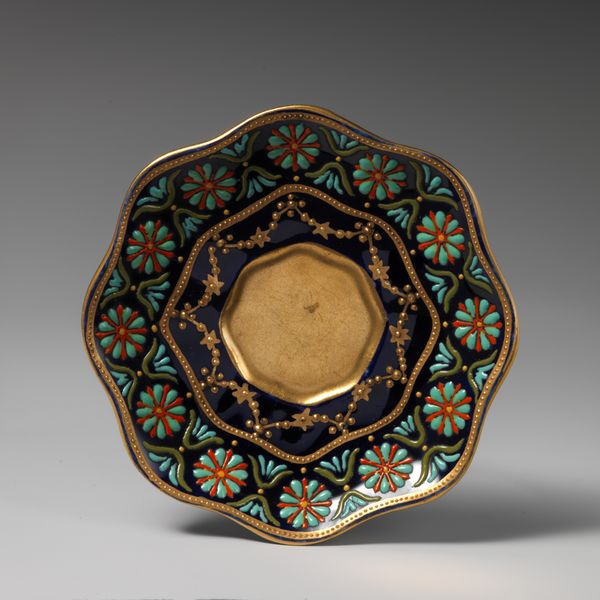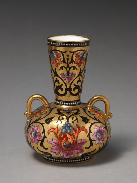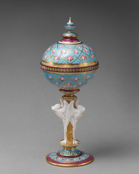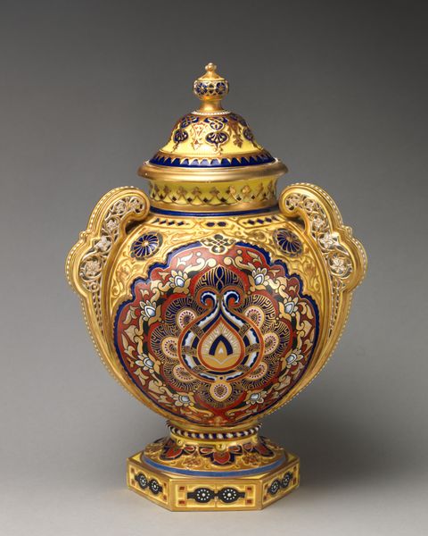 This striking U-shaped vase with handle was crafted by Minton, featuring stylized motifs that echo across cultures. Look closely at the vase's body: notice the painted zoomorphic figure of a serpent with its head bent over a cloud-like form, a motif that may evoke the ancient symbol of the Ouroboros. The serpent encircling itself appears in ancient Egyptian iconography and Norse mythology, often representing cyclicality and renewal. Here, the image may have been used to invite contemplation on life's ever-changing, self-renewing nature. Moreover, the geometric forms around the base of the vase recall the 'meander,' which frequently appears in ancient Greek art, symbolizing eternity or the unbreakable bond of kinship. Observe, too, the bright blue. How this color has been culturally coded over time, shifting from representing royalty and wealth, to sacred truths. Such recurrences are not mere coincidences but instances of the human psyche's enduring fascination with particular images. Our collective subconscious is a potent force, imbuing these symbols with an evocative and deeply affecting aura. The vase embodies a timeless engagement with symbolic forms, reappearing across different epochs and geographical regions.