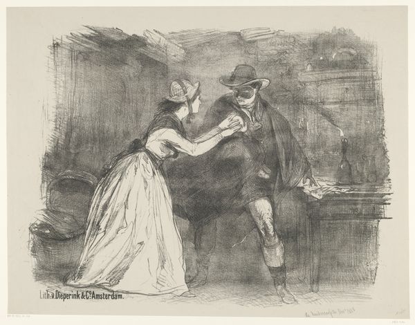 Curator: Here we have Henri de Toulouse-Lautrec's 1894 work, "Ida Heath at the Bar," a genre painting rendered with pencil in a print medium. Editor: Right away, the sheer delicacy is striking. It's so faint, almost as if these figures are fading from memory. There's something spectral about it. Curator: Absolutely, the sketch-like quality lends itself to that fleeting impression, so common in Impressionist works. Lautrec frequently depicted scenes from Parisian nightlife, offering a glimpse into a very specific world and time. Bars, cabarets… these were stages for social performances. Editor: That's it, a performance! I'm getting this overwhelming sense of melancholy though. Maybe because of that top-hatted figure’s slightly unsettling gaze? It’s all whispers and knowing looks in a smoky haze. And Ida herself… what's she thinking? Curator: It could be a comment on social interactions. Look at the placement of the figures – they're close, but not necessarily intimate. The symbols—the bar itself, the accessories like the gentleman’s cane—they signify social class, leisure, and a certain detached way of relating. Think about the historical context; this was the Belle Époque, a period of excess but also anxieties lurking beneath the surface. Editor: Excess and anxiety—such a good way to capture it. And this feeling of the hidden, maybe even forbidden. Even the woman, Ida Heath, looks like she is trying to remain invisible within the haziness. There’s a kind of sadness there, isn’t it? Curator: Indeed, and Lautrec masterfully evokes that mood through these subtle visual cues. It speaks to the complexities and often contradictory nature of human experience within a specific cultural milieu. This kind of image acts like a portal, offering insight into our understanding of that time period. Editor: You've given me so much to reflect on! All these hidden anxieties in the sketch are coming alive. I think I am starting to appreciate that there's more to this scene than just initially meets the eye. Thanks! Curator: It was my pleasure. I hope it illuminated some of the symbolism at play here!