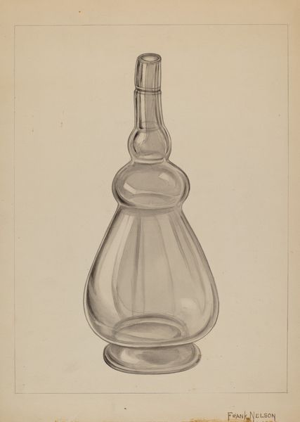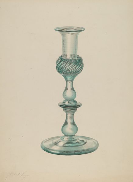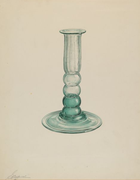 Curator: Here we have Elisabeth Fulda's "Candlestick," likely created around 1939, rendered in watercolor. It depicts a glass candlestick holder. What's your take on it? Editor: There's a delicate quality to it. The artist's use of watercolors creates a sort of hazy, dreamlike effect. I find it both simple and elegant. Curator: Considering the era, you know, just before World War II truly gripped Europe, functional designs like this gained a different meaning. Everyday objects became almost defiant expressions of normalcy. How do you think this watercolor contributes to that? Editor: The composition is certainly quite ordered; it's got a solid, centered verticality, the curves and lines meticulously crafted with some symmetry in the lower part and the stem but contrasting at the top, creating a bit of focal tension in that area. Curator: Right. Fulda worked during a time when functionalism, as seen in the Bauhaus movement, deeply influenced design. But it’s also interesting to see a handcrafted approach celebrating an item meant for daily life through the medium of fine art. A bit unusual but refreshing. It perhaps indicates how one makes sense of their reality using different forms of art. Editor: You can definitely sense that intention through the artist's attention to how the light interacts with the glass. See the transparency? The shades and colors blending smoothly create depth, imbuing a sense of both weight and ethereality. The choice of the light greenish blue color supports the mood it sets. Curator: Indeed, color plays a key role in setting the mood, given how its function and the social context surrounding candelabra—once objects central to interior illumination and social gatherings, slowly losing relevance with the rising presence of technology at home. This, coupled with the coming of war. How can we ignore its impact on the way we experience the ordinary? Editor: Good point. Maybe the very clarity in form reminds one to cherish simplicity, to seek warmth and solace through objects from a world threatened by chaos and uncertainty, an intimacy we find and take pleasure in. Curator: A quiet statement, perhaps? That an artifact intended to cast light, even in the dark times ahead, retains a place in the everyday imagination? I like that thought. Editor: Me too. This little candlestick is surprisingly resonant.