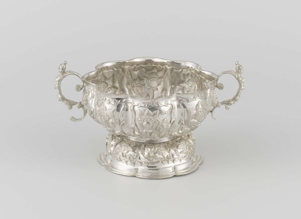 Curator: What a fantastical piece. At first glance, I see an object lifted straight from a fairy tale, reflecting a desire for display as much as utility. Editor: Indeed. This is a silver basin and ewer, made in 1649 by Andries Grill. Ewers like these were fashionable items. Their significance lay less in functionality and more in embodying power and refinement. Curator: I notice immediately the dragon-shaped handle; in Western iconography dragons often represent guardians, and they signify strength and authority. Given this piece was likely owned by the elite, would that reading be apt in this case, reinforcing wealth and status? Editor: I think that reading definitely holds weight here. Furthermore, note how the dragons on the handle support it, emphasizing service and reliability which were expected of elites, but, conversely, the ornamental dragons and swirling relief might express their detachment from those very concerns. Curator: The piece does emanate almost icy self-assurance and aristocratic distance. The metal work gleams but lacks warmth; its intricate embellishments impress but don't invite closer human engagement. It stands on its own as an emblem. How do you read this from your viewpoint? Editor: Considering how water basins were used to purify the hands, this ewer takes on further meanings: the visual display of cleansing as a sign of piety, yet the ornamental luxury suggests this action has become merely a ceremonial privilege devoid of true reverence. Its use becomes entirely secondary. Curator: Very insightful! The Baroque love for opulent detail meets ideas about hygiene, creating a complex social display. What seems a simple object contains layers of wealth, status, and self-presentation deeply embedded within 17th-century society. Editor: Yes, thinking about this basin and ewer, its imagery encourages us to look into both personal vanities, and those of its wider society.