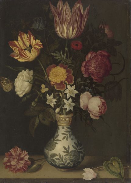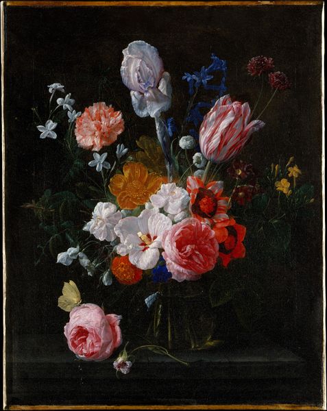 Editor: This is Jacob Marrel’s "Stoneware Jar with Flowers," painted sometime between 1626 and 1681. The deep darkness contrasting with the vibrant florals really draws me in. What can you tell me about this painting? Curator: Well, the Dutch Golden Age was a fascinating period. How do you see this still life fitting into, or perhaps pushing against, the traditional narratives of that era? Think about the rise of mercantilism and its impact on art. Editor: I guess I hadn’t considered the economic factors. I mostly just saw it as a pretty picture of flowers. Curator: Pretty yes, but also political. Floral paintings during this time weren’t merely decorative; they were tied to the booming global trade in exotic flowers. The intense realism celebrates not only the beauty of nature but also Dutch dominance in international commerce. What about the way the flowers are arranged – does that say anything to you? Editor: They're all crammed together. It feels a little unnatural. Curator: Exactly! That unnaturalness, the display of flowers from different seasons blooming together, speaks to the control and manipulation of nature for profit and status. The very act of preserving something so ephemeral speaks to the Dutch obsession with possessions and their fleeting nature. The 'memento mori' theme. Do you see how wealth changes art and culture? Editor: That makes total sense! I never considered the flowers themselves could be symbols of wealth and power. Curator: And even vulnerability, think of the preciousness of the wares and trade routes required to obtain something so exquisite. This work becomes a historical record. Editor: I’ll definitely look at Dutch Golden Age paintings differently now. Thanks! Curator: Absolutely. This kind of painting invites us to look closer at what stories about gender, race and class it reveals, once you know the art!