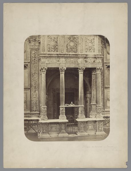 Editor: Here we have Médéric Mieusement’s photograph "Schouw in het kasteel van Blois," sometime between 1875 and 1900. I’m immediately struck by the stark, almost ghostly quality of this fireplace; it feels like a monument to a bygone era, but I'm interested in what elements define it. What captures your attention when you look at this image? Curator: The detail, definitely. Isn't it fascinating? Like finding a fossil and imagining the creature it once was. I'm struck by the stillness. The ornate mantle practically whispers of crackling fires, doesn't it? The history etched in those details… But more than that, to me, this isn't *just* a fireplace, this image tells a story. How do *you* perceive its cultural context, especially within its historical backdrop? Editor: It feels very frozen in time. As if the grand room is forever quiet now. Curator: Exactly! It reminds me of the architecture of its time; the late nineteenth-century fascination with preserving, recording, and categorizing architectural antiquities through photography, sort of as evidence of their cultural identity... it's powerful in a rather gentle, sepia-toned way, no? How does this almost archaeological stillness resonate with *your* interpretation of its mood? Editor: That’s an interesting angle! So it’s not just a depiction, but a kind of preservation attempt through the photographic medium? Curator: Precisely! It speaks to how architecture embodies history, experience, time itself— captured in a single, silent image. Editor: I’ll never look at architectural photographs the same way again. It's almost a form of time travel through observation! Curator: Glad to know. This kind of work can lead down wonderful rabbit holes if you let it.