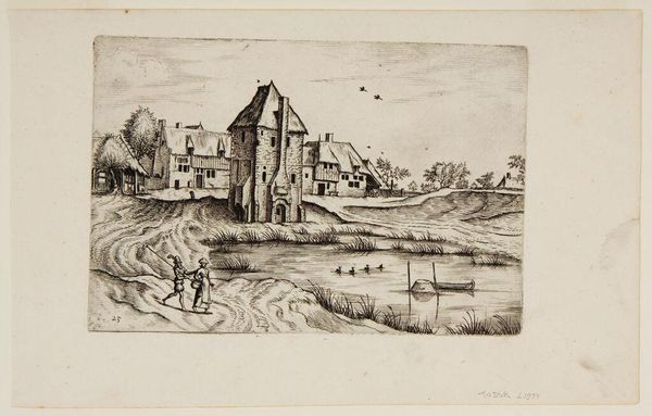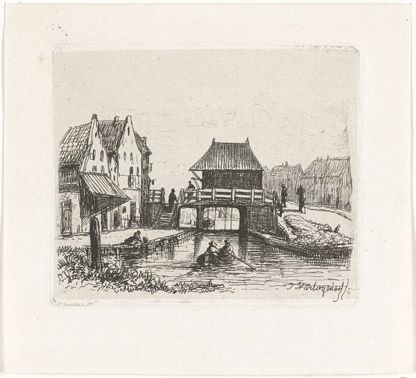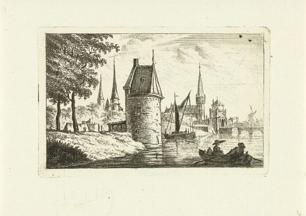 Editor: So, here we have "Cityscape by a River," a pencil drawing on paper by Arnoldus Johannes Eymer, created sometime between 1813 and 1863. It's incredibly detailed and gives off a feeling of peaceful nostalgia, like looking into a memory. How do you interpret this work? Curator: What I immediately see is the potent symbolism of the river. Rivers, throughout art history, represent the passage of time, the journey of life. How do you see that manifested here? Editor: I guess the stillness of the water gives a sense of reflecting on the past, not really the rush of the present? Curator: Precisely! And consider the tower in the middle distance. Towers often symbolize power, but also isolation. Look how it dominates the skyline but is somewhat separated from the daily life by the riverbank in the front, where the people sit quietly and contemplate the flow of water. Does the contrast of near and far suggest an element of tension in what may otherwise appear tranquil? Editor: I didn't think about the tower representing power… It felt more romantic and picturesque at first. Curator: That's a valid point. But Romanticism wasn't just about pretty scenes; it was about feeling the weight of history, exploring emotional intensity, and recognizing the sublime. Look at how the artist chose to create light in this landscape – using light pencil strokes in the sky versus shadow behind the tower, in front of which are the figures in sunlight… Light and shadow create feeling. How would you say this use of contrast emphasizes your feeling about the image? Editor: The subtle light makes it seem less about grand statements of power and more about personal reflection, especially with those figures quietly by the river. I didn’t pick that up at first. Curator: And that quiet contemplation is part of the language of this era. Through this drawing, the artist leaves an echo of how a citizen saw and valued their changing world. Editor: It’s like the image becomes a symbol itself, a little memory held on aged paper.