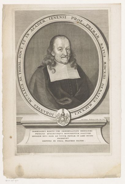 This print of Johann Andreas Lucius was made by Johann Caspar Hoeckner, likely sometime in the mid-17th century. It's an engraving, meaning that the design was incised into a metal plate, which was then inked and printed onto paper. The intricate detail achieved in this portrait speaks volumes about the engraver’s skill. Look closely, and you'll see the way Hoeckner has used fine lines to create a likeness, varying the marks to capture light and shadow. This wasn't just about technical mastery, but time, labor, and the economic exchange for such specialized work. Also, consider the social context. Engravings like this were often commissioned to commemorate important figures, circulating their image and reinforcing their status. The choice of printmaking – a reproducible medium – suggests an intention to disseminate Lucius’s image widely, tying the work to the emergence of mass media and consumerism. Ultimately, this print is more than just a portrait. It's a testament to the skills of the craftsman, and a reflection of the social and economic forces shaping the world in which it was made.