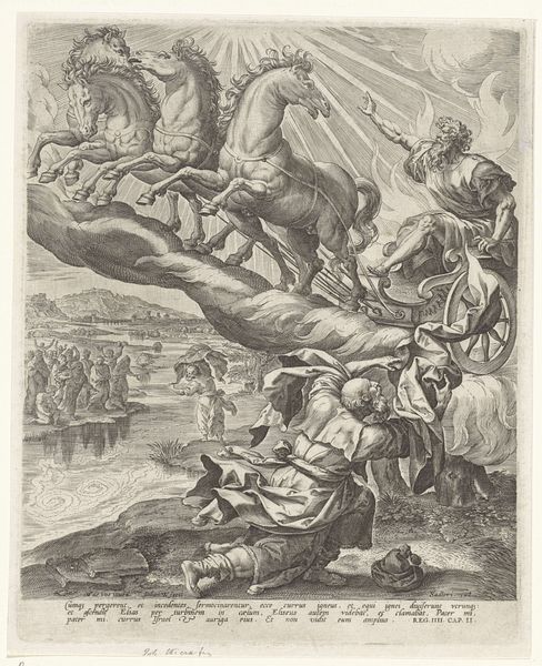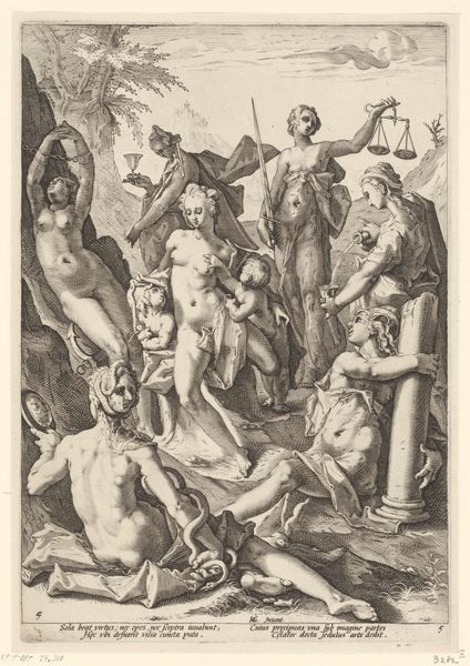 Curator: Jacob Folkema created this engraving, titled "Allegorische voorstelling met vrouw, Vader Tijd en putti", in 1720. Editor: There's an almost overwhelming feeling of density here—so many figures crammed together, and yet, the fineness of the engraving gives it a surprising lightness. Curator: The density speaks to the complexities of the allegorical genre popular at the time. Think of it as a visual argument, presenting layers of symbolism meant to unpack particular historical and societal claims. How do you see gender represented within such a complex visual? Editor: It’s fascinating. We have this central female figure surrounded by symbols of navigation and prosperity—but literally underpinned by figures of labor: sailors in the distance, this sort of merman pumping water into the scene... All literally providing the basis for her idealized stance. It lays bare, in some ways, the means of production needed for any idea of 'allegorical' greatness. Curator: Exactly. The woman at the center holds a compass, suggesting knowledge and perhaps colonial expansion. But the 'merman' grounds the image in concrete realities. We need to question who really benefits and to what material extent they are truly acknowledged by all of these symbols. The Baroque clearly has class divides in its message! Editor: The engraver uses fine lines to show light glinting off objects. Looking closely at the figure of Father Time standing right behind the seated woman holding up a scythe - an absolute emblem for the labor of reaping and production. This detail of Father Time shows, literally, labor looming in the background: laboring to maintain itself! Curator: Indeed. These aren’t just aesthetic flourishes; they speak to the era's dependence on maritime trade and labor exploitation for accruing wealth. Understanding the full narrative of Folkema's allegory demands scrutiny of this nexus between human work, global commerce, and evolving social norms. It reminds us how often dominant symbols serve to naturalize and obscure inequity. Editor: Examining the materials and modes of production of the art object itself alongside its subjects exposes similar disparities of representation. It serves as a great lens to explore historical narratives through art. Curator: Absolutely. Engaging with "Allegorische voorstelling met vrouw, Vader Tijd en putti" requires us to confront uncomfortable truths about how narratives of progress and success were historically constructed—often masking the sacrifices of certain communities for the advantages of others.