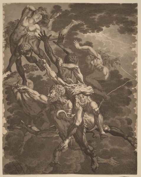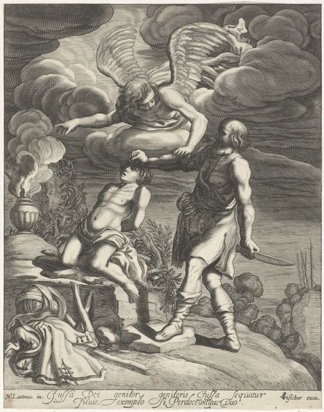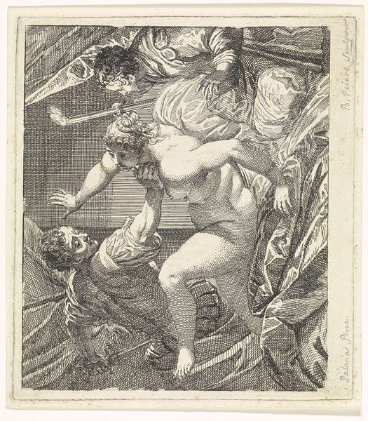 Curator: This etching, dating from 1590 to 1632, is titled *Opstanding van Christus*, or *Resurrection of Christ*. Pieter de Jode I is credited with its creation. It’s currently held at the Rijksmuseum. What's your first reaction to it? Editor: Chaos. The composition, the frantic gestures of the figures...it conveys a sense of utter disarray. Are they soldiers being thrown back from the tomb? Curator: Indeed. De Jode uses the etching technique masterfully to capture that sense of upheaval. Think about the process – the laborious scratching into the metal plate, the inking, the printing – to create such a dynamic image of this significant biblical event. Editor: It's interesting to consider the accessibility of printmaking at this time. How would an image like this have circulated? And to whom? Did prints like this become part of the broader political and religious landscape, shaping public perceptions of the Church's authority? Curator: Absolutely. Consider that the production of such prints, although seemingly less ‘unique’ than paintings, still relied on skilled craftsmanship. Each line had to be carefully etched, controlled by the artist. This engraving served both religious instruction and demonstrated artistic labor. And this piece definitely shows clear Baroque stylistic conventions, figuration with narrative elements. Editor: And were the viewers actively engaged in a way similar to theatre? Because there is such heightened emotional drama expressed in each character it draws you into its own constructed social situation. And where were these distributed or seen by most? The scale suggests personal devotion more than public spectacle. Curator: Very perceptive. These were often made to commission, or to fulfil particular devotional markets; their appearance being determined as much by economics as artistic expression. Considering also the availability of similar artistic prints helped develop taste across the society. Editor: Thinking about the modern perspective on labor that went into making this piece as an object for private devotion offers us insight into both economics of religious dissemination in this period and provides the tools to approach works by De Jode’s contemporaries. Curator: Precisely, analyzing art from the materials to their circulation highlights its wider public life and its potential impacts.