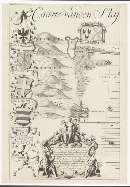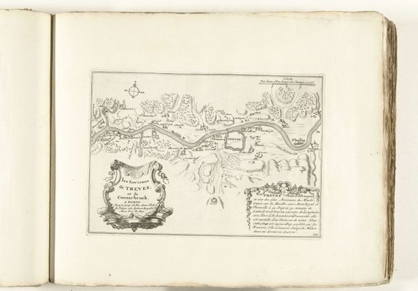 Editor: This is “Kaart van de rivier de Eem (eerste deel),” or "Map of the River Eem (first part)," created by Thomas Doesburgh in 1692. It's an ink and engraving drawing on paper, housed at the Rijksmuseum. Looking at this, the precise lines and organized composition really strike me. It feels very technical and meticulously rendered. What aspects of this piece grab your attention? Curator: Immediately, it is the dialectic between precision and abstraction. The map's function is explicitly representational, but observe how Doesburgh employs line weight and density. See how he uses the variations in linework to denote topographical features versus political demarcations. What semiotic system can we decipher from this interplay? Editor: It’s almost like he's creating a visual language with the line itself! The varying thicknesses help distinguish, say, a settlement from a geographical boundary, wouldn't you agree? Curator: Precisely! Consider, also, the visual weight. The ribbons displaying family crests aren't functionally related to the river's course. Yet, they occupy considerable space, diverting the viewer’s eye. Does this not shift the piece away from pure functionality, inviting subjective, even aesthetic contemplation? Is the artist commenting on the influence and prestige of these families on the River Eem and its traffic? Editor: That's a perspective I hadn't considered! It reveals a power dynamic literally mapped into the landscape. So, the artwork functions beyond just being informative; it also visually represents a hierarchy. Curator: Yes. Ultimately, the essence of the map is in its articulation, and Doesburgh’s orchestration of graphic elements to give the visual effect more volume and depth. This allows us to gain insight and form opinions regarding the map as a diagrammatic code for social structures. Editor: This deepens my understanding, it’s not just about location, but layers of meaning communicated through visual language. Curator: Indeed; an appreciation of pure line becomes an appreciation for more complex realities.