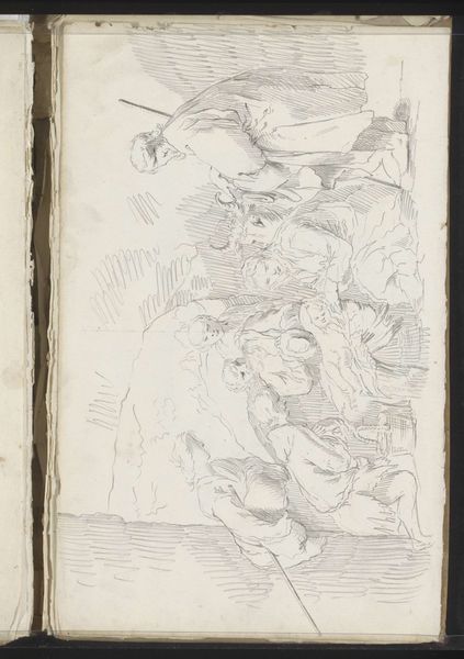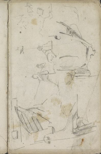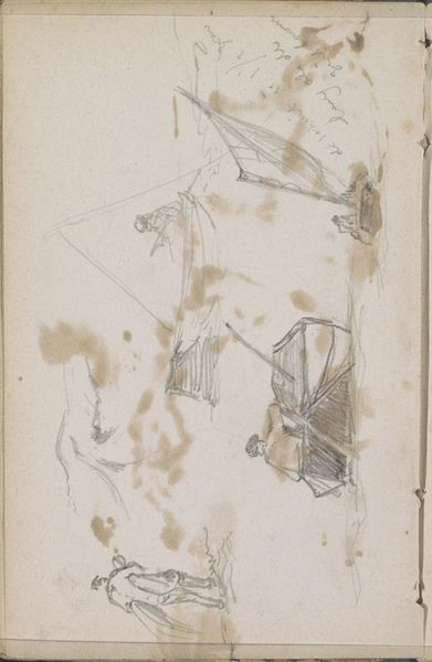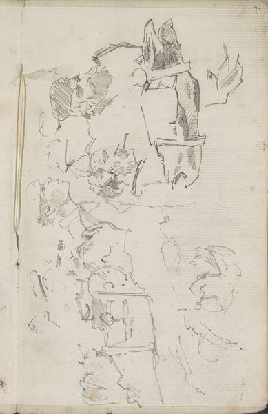 Curator: This is a pencil drawing by George Hendrik Breitner, dating from around 1880 to 1882, entitled "Paarden en soldaten, mogelijk artilleristen," which translates to "Horses and soldiers, possibly artillerymen." Editor: Immediately, the drawing strikes me as being caught between tension and quietude. There's a frenetic energy in the sketched lines, yet the muted tones evoke a subdued atmosphere. The symbolism suggests the theater of war, or perhaps simply men and beasts at rest. Curator: Indeed, the ambiguity is key. Breitner, a significant figure in the Dutch Impressionist movement, often depicted military subjects, capturing both their everyday routines and, subtly, the larger social context of the army. These images weren't explicitly political but reflected an ongoing presence in Dutch life. Editor: Looking at the drawing itself, it feels quite raw. There’s no attempt to idealize the subjects. It’s all fleeting lines and suggestions of form. The realism of the moment captured feels honest, immediate. Is that what drew him to depicting military figures? Curator: I think so. Breitner aimed for direct representation and a psychological honesty, avoiding bombast in favor of observed moments, capturing impressions and human activity as it unfolded. And horses held significant cultural meaning, connoting power, labor, even impending conflict. Editor: Those rapid lines...almost as if capturing movement, transience, that almost cinematic feeling... and that lack of a central focus point. Are we, perhaps, encouraged to wander through it ourselves? Curator: It’s fascinating how a simple pencil drawing, relying primarily on line, can evoke so much. By leaving the image unresolved, the cultural connotations become more powerful as our own experiences fill the void and complete the narrative. Editor: Absolutely. Its power lies in this incomplete impression, a brief glance at these soldiers and horses from another era. Curator: I agree, it resonates with a very present emotional energy, almost raw nerve, despite being rendered in muted pencil strokes. Editor: So evocative; I find myself considering my relationship with the work rather than dissecting its creation.