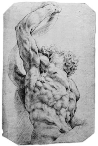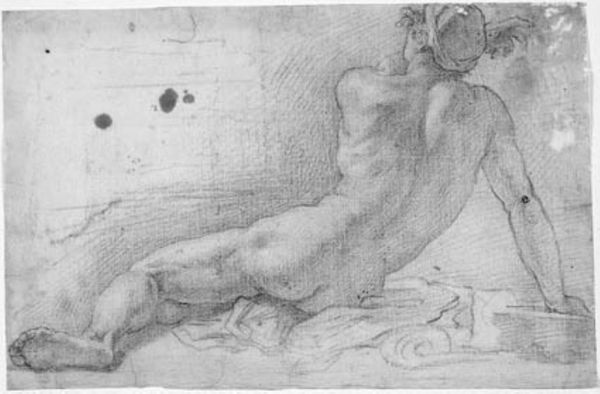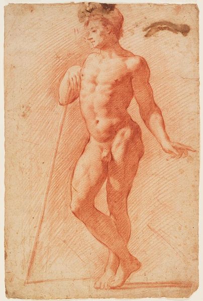 Curator: This is Ubaldo Gandolfi's "Seated Male Nude," housed here at the Harvard Art Museums. It depicts a man, sketched in graphite, seated on a rocky form. What strikes you first about it? Editor: The rendering of the figure. The pose exudes introspection, but the raw materiality of the drawing—the graphite on paper—creates an immediacy. It feels both classical and modern. Curator: Graphite allowed for the rapid development of ideas, linking academic practice to artisanal techniques. The cross-hatching defines form economically, revealing Gandolfi’s understanding of light and shadow but also the efficient use of materials. Editor: Absolutely. The composition, though, directs my gaze; it moves from the defined contours of the body to the loose background hatching. The tension holds the eye. Curator: Gandolfi’s workshop context is important here. Drawings like this served as models, demonstrating mastery and were circulated among his assistants. They showcase artistic production as a collaborative effort. Editor: Still, it's hard to ignore the elegance of line and the way the artist captures the essence of the human form with minimal means. It is compelling in its simplicity. Curator: Indeed. The confluence of academic training and workshop practice makes Gandolfi’s drawing an interesting artifact reflecting artistic and social values of his time. Editor: I agree, it's a testament to the enduring power of form, even in a quickly executed sketch.