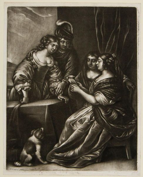 Wallerant Vaillant created this mezzotint, Brieflezende vrouw op een terras, sometime in the 17th century. The print presents a study in tonal contrasts, primarily achieved through the mezzotint technique, which allows for rich gradations of light and shadow. The composition is carefully arranged with the figures forming a pyramidal shape, anchored by the woman reading the letter and ascending towards the standing couple. The artist masterfully manipulates light to guide the viewer's eye, highlighting key narrative elements, such as the expressions on the faces of the subjects. Vaillant employs a system of signs through gestures and gazes. The letter itself functions as a signifier of communication, emotion, and perhaps social intrigue. These structural elements convey a sense of depth and psychological complexity. Vaillant transforms a genre scene into a commentary on human relationships and social dynamics, captured through the lens of formal elegance.