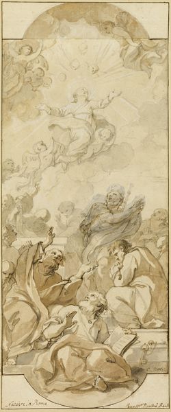 Editor: This is a red chalk drawing from the 17th century called *Madonna and Child Adored by Two Male Saints*. The composition feels very pyramidal and reverent, all gazes and gestures focused on the Virgin and Child at the apex. What can you tell us about the symbolism at play here? Curator: Indeed. Red chalk itself speaks to a tradition of Renaissance artistry, particularly the study of the human form and drapery, hinting at a concern for classical ideals. The pyramid you mention, placing Mary and Jesus aloft, is also quite intentional. What do these compositional choices communicate about cultural memory, do you think? Editor: It feels like it establishes a clear hierarchy, almost divinely ordained. But are there other symbolic elements we should be aware of? Curator: Absolutely. Consider the saints. Who might they be, and what do their attributes—the staff, the kneeling posture—tell us? Saints often operate as cultural touchstones, inviting viewers to connect with particular virtues or narratives within Christian history. Notice their bare feet... Editor: Is that a sign of humility? Curator: Precisely. The artist is speaking a visual language deeply embedded in its cultural moment. Humility, piety, the divine right of the Virgin to be venerated—all communicated through gestures, attributes, and placement. How does this impact the emotional weight of the image for you? Editor: It gives a stronger sense of reverence and admiration. The way the saints are gazing upward really reinforces that feeling. It's almost like they're mediating between us and the divine. Curator: Well observed. This image provides a window into not only artistic skill, but the very way that 17th-century individuals were taught to think about holiness, power, and their place in the cosmos. Editor: It’s incredible to think about how artists embed all those complex layers of meaning into a single drawing. It changes how I'll look at art from now on. Curator: The dance between what is seen, what is meant, and how it resonates through time, that is the enduring power of visual language.
