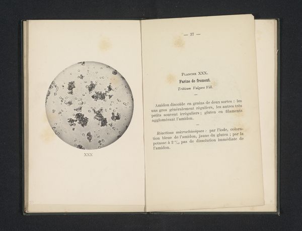 Curator: Looking at these open pages, the illustration to the left appears like a celestial body seen through a telescope, yet its organic forms and minute detailing suggest a close study of terrestrial matter. Editor: It's evocative, isn't it? It reminds me of an early photograph of a nebula—something seen for the first time through new technologies, blurry and profound. But there's also something undeniably scientific about the arrangement of elements on the page. Curator: Absolutely. We're looking at a plate titled "Microscopische weergave van Juniperus Sabina"—a microscopic representation of Juniperus Sabina, or, more commonly known as Savin Juniper. It’s by Léon Herlant and was created before 1896. Editor: Juniper. Well, that grounds the ethereal impression, doesn't it? How was this plate originally circulated? Curator: It comes from an age where the boundaries between art and science were more porous, serving perhaps an educational purpose, intended for students of botany or medicine, rather than art aficionados. It reflects an imperialist impulse of collecting and naming as part of our knowledge acquisition. Editor: So it's essentially a deconstruction—a microscopic, almost abstracted view of a very familiar, perhaps even culturally loaded plant, as Juniper holds significant symbolic weight in various traditions...a symbol of protection and purification. The details clustered around a central mass remind me of alchemical symbols and arcane texts. Curator: Indeed. I’m struck by how the circular vignette on the left and the text on the right serve to create a binary, much like how our own brains perceive and process. This division between the observational, objective view and the descriptive linguistic representation reminds us of how humans came to know about nature, both systematically and individually. Editor: In a world saturated with perfect digital renderings, there's a palpable honesty to its creation, where imperfections add to its narrative and force us to appreciate the painstaking labour required to render such scientific imagery by hand. It’s fascinating to observe what previous generations chose to document and archive as important information to disseminate. Curator: Precisely. What was valued, what knowledge was seen as crucial to pass down. This image encapsulates an era of profound discoveries. Editor: Thank you, this really gave me a different perspective on how scientific observation and human symbolic systems work.