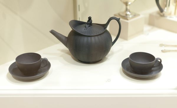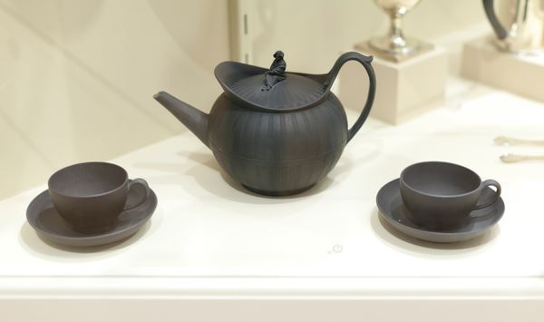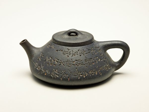 Curator: What an intriguing piece! We’re looking at a Wedgwood teapot, crafted around 1780. It currently resides in the Minneapolis Institute of Art. Notice its Neoclassical design executed in black basalt earthenware. Editor: My first impression? Brooding elegance. It’s the kind of object a melancholy poet might use—stark, beautiful, almost severe. The tiny figure on the lid—she seems pensive, perched there. Does she even realize she's on a teapot? Curator: That severity is a conscious choice. Wedgwood tapped into the Neoclassical aesthetic, associating his wares with virtue, reason, and refinement. This teapot reflects an elite aspiration. Beyond its functional use, objects like this declared status. Moreover, consider Britain's socio-political context: the rise of industrial manufacturing and empire, and abolitionism were highly debated. Editor: So it’s trying to be morally and aesthetically pure. Yet, doesn’t the very act of making something so elaborate and beautiful almost…contradict simplicity? Like, here I am, trying to sell moral superiority through decorative arts! The lady perched on top seems completely self-absorbed, indifferent to what the spout of judgement it will eventually pour forth. Curator: Exactly! This paradox highlights the inherent tensions within Neoclassicism and Wedgwood’s ambitions. These luxury goods, frequently made with enslaved labor, directly refute notions of virtue! That is part of why it's a testament to cross-pollination in arts and political engagement that is still of vital importance to designers and social institutions today. Editor: And yet, that contrast is what makes it endlessly interesting. Its formal design, while trying to be rigid, still flows, particularly that fluid handle. Perhaps it represents the contradictions inherent in human nature itself—our high-minded ideals forever wrestling with reality. Curator: It really encapsulates the complexities of that era and decorative arts influence. Editor: Agreed. Something about it makes me want to curl up with a book and a dark, smoky brew. I think this unassuming little stoneware is far from just an elaborate luxury item.