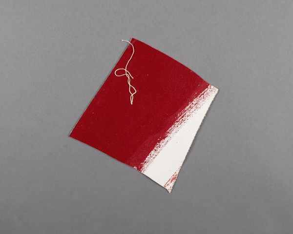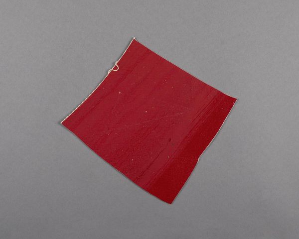 Curator: Here we have Barnett Newman's "Painted canvas fragment," a small piece, only about 9 by 5 inches. My immediate impression is how much the orange dominates, almost aggressively. Editor: The orange certainly leaps out. I wonder, though, about its placement on the larger canvas. Orange, especially a saturated hue like this, has a long history. Considering how much Newman was focused on existential questions, this orange could symbolize vitality, passion, or even warning. Curator: Perhaps, but look at the raw edge, the visible weave of the canvas. It feels more like a study of color, a material investigation. The texture of the paint itself, the way the brushstrokes interact – that’s where I see the meaning. The white slash is so abrupt... is it a zip in miniature? Editor: It could be. Newman’s zips are often interpreted as divisions, but also as connections to something transcendent. Even in this fragment, I can sense that tension, that search for the sublime within the earthly materials. Curator: I see what you mean. It's amazing how much feeling can be packed into such a small, seemingly simple piece. Editor: Exactly, this fragment still resonates long after its creation.