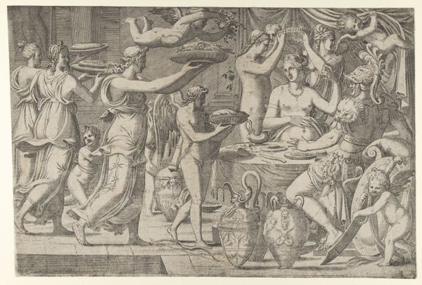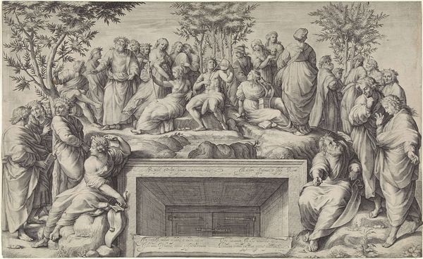 Curator: Diana Scultori, a fascinating figure, created this print, "Christ and the Woman Taken in Adultery." The scene feels so weighty, doesn't it? Editor: Yes, the density of the etching itself adds to that feeling. Look at how she builds up the lines to create depth, especially in the drapery. It feels almost sculptural, doesn't it? Curator: Absolutely. Notice how the columns frame Christ and the woman, almost isolating them within this space of judgment. There’s an emotional intensity in their postures. Editor: I'm struck by the way she uses the medium itself to convey the narrative's tension. Etching, with its reliance on acid and metal, becomes a metaphor for the harsh judgment being enacted. Curator: And yet, within that harshness, there’s also this delicate rendering of the figures, suggesting the possibility of redemption and divine mercy. Editor: The very act of engraving, a slow, deliberate process, mirrors the careful deliberation Christ takes in his response to the situation. Curator: It's amazing how Scultori uses her skill to explore complex themes of sin, judgment, and forgiveness. Editor: Seeing the labor involved makes me reconsider the power structures in this scene, the vulnerability of the accused, and the materials that give it form. Curator: I agree; it’s an image that stays with you, prompting deeper reflection on the enduring themes it presents. Editor: Indeed, and the story of its making only adds to its resonance.