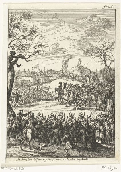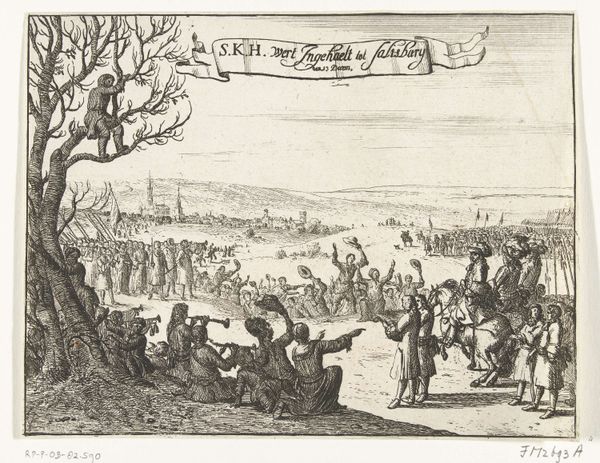 Curator: This etching from 1680 is titled “Feestmaal bij de begrafenis van Gerrit Dirksz. den Uyl, herbergier te Sloten.” It depicts a feast at the funeral of Gerrit Dirksz. den Uyl, a tavern owner in Sloten. Editor: My first thought? It looks like quite the raucous send-off! The detail in this piece is impressive, particularly considering its size. What immediately strikes me are all the bodies - so many bodies relaxing, sitting on the ground, eating, drinking! The scale of labor and supplies needed for the scene must have been gigantic. Curator: It does offer us a fascinating glimpse into 17th-century Dutch burial customs. This wasn’t just a somber occasion; it was a public event, a social spectacle practically. Look at the sheer number of people participating, as though this public display of mourning provided social value in some way. Editor: Absolutely. And what a contrast between the fine lines detailing the people feasting and the heavy forms of the barrels and food stores on the ground. The engraving process itself would have required significant resources and skill, pointing to the deceased’s standing in the community. Etchings like these helped standardize imagery and were cheap to produce for a relatively large audience, creating a popular collective memory. Curator: Yes, and that’s important! The act of commissioning an etching transforms a personal loss into something public and, arguably, helps cement social bonds. Note how the procession snakes its way from the church and leads directly into the feast. The church has seemingly blessed what could be seen by some as excessive material consumption after someone passes on. Editor: I also can't help but notice the swan hanging above the party! Is that part of a decorative scene or an actual tavern ad? Regardless, it does create an interesting contrast. The viewer can draw immediate conclusions about the type of food and work the community valued back in 1680, and that says a lot about this era and society. Curator: Precisely. It encapsulates a very specific cultural moment, highlighting how funerals were significant displays of community and status. The image then provides a snapshot into an economy focused on local commerce, community connection, and public performance. Editor: A poignant reminder that even in death, the material realities of life – labor, production, consumption – continue to shape our rituals and memories. I appreciate the perspective this artwork can give us on the past and its possible parallels to modern day mourning practices.