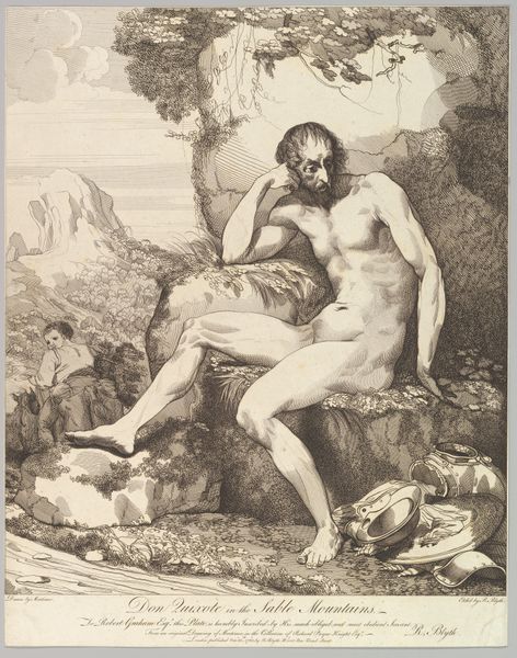 John Hamilton Mortimer etched this work, Nebuchadnezzar Recovering His Reason, capturing a pivotal moment of transformation. The figure of Nebuchadnezzar is a powerful symbol: a king brought low, now humbled and on the verge of regaining his humanity. Note the king's bestial posture and claw-like hands. This image echoes the ancient motif of the "wild man," a figure found across cultures, representing the untamed aspects of the human psyche. We can trace its lineage back to the Epic of Gilgamesh, where Enkidu, the wild man, is both feared and revered. Similarly, Nebuchadnezzar’s descent into madness reflects a primal state, a regression to instinct before reason. His hand on his chest, a gesture laden with emotion, is a fascinating detail. It speaks of a return to self-awareness, a reawakening of the soul. This gesture, universal in its expression, transcends time. Think of depictions of saints or tragic heroes throughout art history, each clutching their chest, indicating sorrow or revelation. The motif reminds us of the deep-seated connection between physical gesture and inner turmoil, a powerful force engaging viewers on a subconscious level.