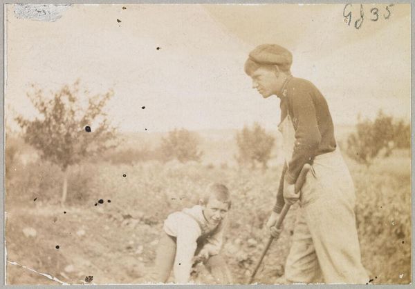 Editor: This is "Hunters in a Field near Magny," a photograph taken between 1897 and 1898. There’s almost a sense of formality, despite the outdoor setting, in how these figures are arranged. What’s the symbolism that speaks to you in this scene? Curator: I'm drawn to the stillness, wouldn't you agree? It speaks to a cultural memory of the rural idyll. But it's not just about tranquility. Consider the act of hunting itself - a ritual loaded with symbolic meaning tied to notions of masculinity and control over nature. The hunters aren’t merely engaging in sport; they’re participating in an established social ritual. How does this read to you? Editor: That's an interesting read. The formal wear, even while hunting, certainly underscores a ritual, a performance even, rather than mere sustenance. Curator: Precisely! And have a closer look - notice the light. Soft, muted tones evoking nostalgia, like an idealized memory being accessed. Think of the pre-industrial world. Does the landscape become part of a cultural echo chamber, whispering to our desires for a lost past? Editor: The soft lighting almost romanticizes the act. What is especially powerful, perhaps, is how seemingly disconnected we are from that sort of existence now, creating this huge gulf between the image and the present. Curator: Exactly! These images remind us to ask what is sustained and lost over time. A potent reminder that even seemingly simple images can carry within them a powerful current of social, and individual, remembrance. Editor: I now see the way images of ordinary life still reflect powerful symbolism and ritual acts.