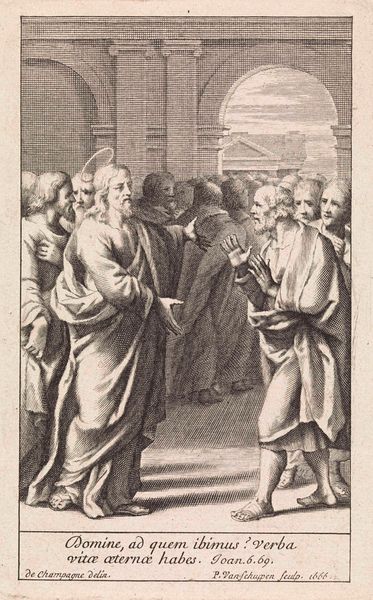 Editor: This is Jacques Callot's "Death of Sapphira," housed at the Harvard Art Museums. It's a very detailed print depicting a dramatic scene. What historical context helps us understand this image? Curator: Callot, working in the 17th century, frequently depicted religious and military subjects. Consider the Counter-Reformation’s emphasis on morality tales. How does this print function within that context, using spectacle to reinforce religious doctrine? Editor: So it's about reinforcing religious authority through dramatic imagery? I see that now. Thanks! Curator: Precisely. The print serves as a visual sermon, reminding viewers of the consequences of deceit in the eyes of God. Callot’s skill disseminated that message widely.
