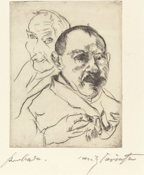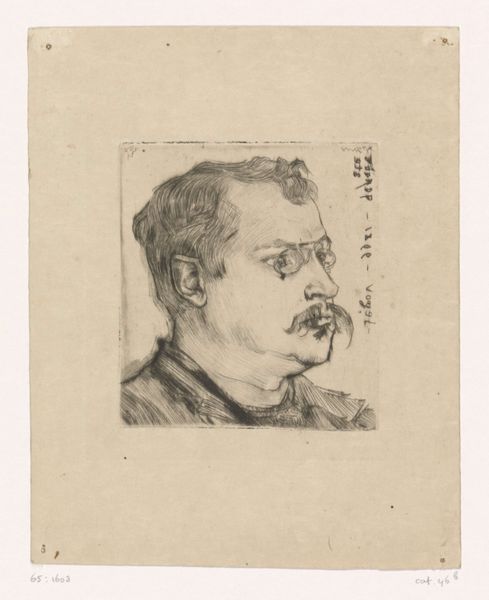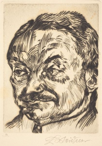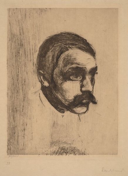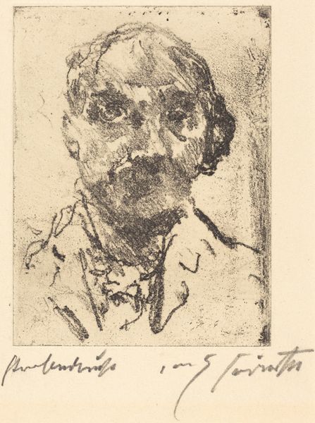 Curator: Edvard Munch's portrait, "Thorwald Stang I," a lithograph held at Harvard, presents a compelling study in contrasts. The stark lines create an almost palpable tension. What's your immediate take? Editor: Unease. He looks trapped, doesn’t he? Like he's peering out from behind bars, or maybe just a very, very troubled mind. The raw quality really gets under your skin. Curator: Indeed. Munch's use of lithography here is fascinating. The density of the blacks and the deliberate scratching away at the stone contribute to that sense of unease you mentioned. It accentuates the planes of his face, imbuing it with a structural severity. Editor: It's almost confrontational, that stare. But vulnerable too. Like he's daring you to look away, while simultaneously begging you to understand. Curator: The interplay between vulnerability and defiance certainly underscores Munch’s broader exploration of human psychology. Editor: You know, looking at it again, there’s a strange beauty in that raw honesty. Curator: Precisely, it's a beauty born of truth.