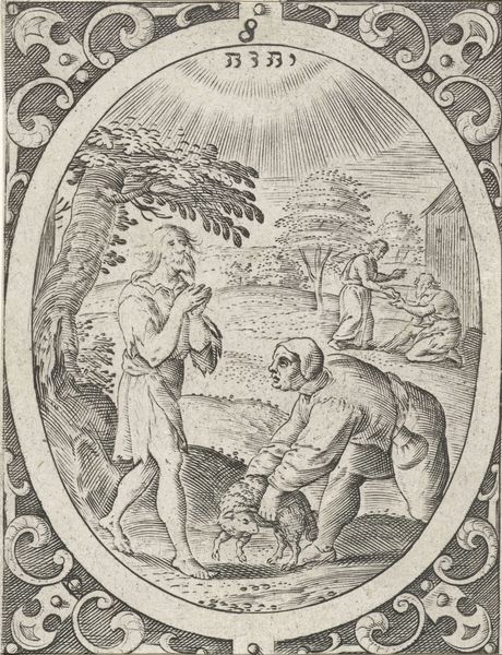 Curator: What strikes me first is the immediate sense of potential this image seems to hold, almost like a secret about to be revealed. Editor: Let’s delve into the particulars of this print, entitled "Tobias vangt de vis," created sometime between 1601 and 1652 by an anonymous artist. It's currently held at the Rijksmuseum, and the medium is engraving. The clear lines of this work exemplify baroque aesthetics, while portraying the narrative of Tobias catching the fish. Curator: Yes, and I want to highlight how the composition reinforces its narrative themes, particularly relating to religious dogma. It reflects prevailing notions of the family’s status relative to forces beyond them – celestial intervention being paramount. Look at how that circular framing encapsulates a very fixed, theological perspective. The presence of angels almost seems more earthly or, dare I say, attainable given their immediate proximity and attire. Editor: Exactly. And note the physicality of it – the tangible pressure of the metal plate, the marks incised into it. You get a sense of a workshop, of a practice being developed, and of material limitations requiring the reduction of narrative into streamlined marks, an aesthetic and practical economy. It highlights labor conditions of production at the time – perhaps contributing, through reproducibility, to new accessible formats. Curator: The way Tobias interacts directly with the fish suggests a tangible struggle that then mirrors socio-political struggles – issues surrounding poverty, inequality, religious conviction... It’s really thought-provoking. How are such material struggles presented or, more precisely, mediated and received by various viewers. Editor: Indeed! By understanding the engraving not just as an artwork, but as a crafted object, we understand more completely the means of artistic production. We’re forced to consider questions surrounding authorship and reception too. The circulation and consumption of images such as these, their sheer materiality – so vital for understanding visual culture of this era. Curator: It truly makes one contemplate how this era understood complex social narratives of gender, and identity... Editor: Yes. From the physical processes of artistic production to the narratives represented, engaging with these tangible elements of "Tobias vangt de vis" allows us a deeper insight into this artwork's existence as part of the history.