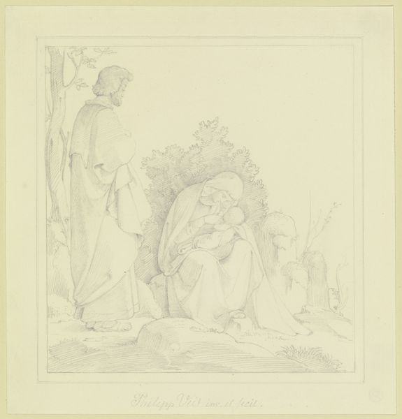 Editor: This is Lorenz Frølich's 1860 pen and ink drawing, "Nymphs Find Eros Sleeping." It’s delicate, almost ethereal. The sleeping figure of Eros has a definite vulnerability about it. What do you see in this piece, especially considering the context of its time? Curator: This drawing resonates deeply when viewed through a feminist lens, particularly in its depiction of Eros, typically a symbol of virility, in a state of repose, vulnerable and observed by the nymphs. Frølich, intentionally or not, subverts traditional power dynamics. The male figure, usually the active agent, becomes passive, feminized almost, within a composition framed by the female gaze and the feminine symbol of nature. Editor: That's a really interesting take! I hadn’t thought of the passivity in that way. Does the period have anything to do with that perspective? Curator: Absolutely. 1860 was a period of considerable social upheaval. Questions surrounding gender roles were bubbling beneath the surface. This work might subtly critique the expected dominance of the masculine, presenting an alternative vision where vulnerability and tenderness are centered, rather than overt power. Notice how the nymphs aren’t predatory but appear almost nurturing. How might we view it in comparison to contemporaneous works? Editor: Perhaps Frølich is offering a softer, more nuanced commentary on relationships between genders than what was normally being offered in academic art? Curator: Precisely. Considering the historical narrative and prevailing societal structures adds another dimension to appreciating the choices Frølich made. Editor: This really highlights how art can be so much more than what appears on the surface, reflecting and questioning social norms. Thank you. Curator: Indeed. By engaging with the social and historical contexts, we unlock richer understandings.