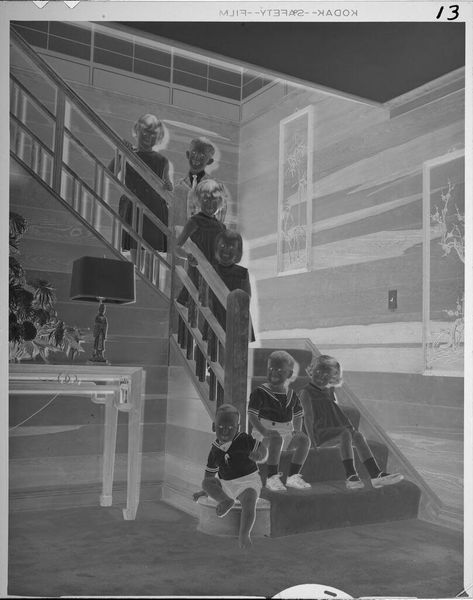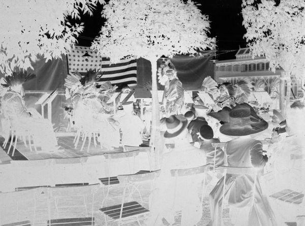 Editor: This silver gelatin print, titled "Untitled (band playing at Christmas ball with santa banner in background)" by Martin Schweig, gives me an eerie feeling. What stands out to you about the material reality of this image? Curator: The photographic process itself is key. Consider the chemical reactions, the labor involved in developing the print, and the social context of documenting such an event. The physical object is a product of specific resources and a desire for preservation. Editor: So, the materials tell a story beyond the image itself? Curator: Precisely. The photographic paper, the developer, the camera—these are all commodities, products of industry that enable this moment to be captured and disseminated. What kind of social ritual do you think this photo documents? Editor: Thinking about it that way really shifts my perspective. It’s more than just a picture; it’s a record of material processes.