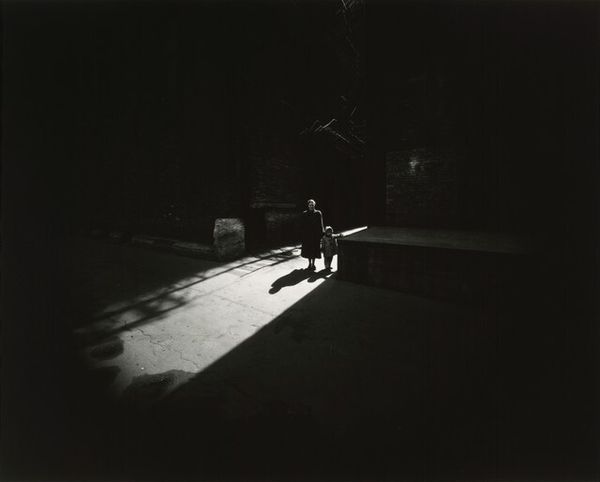 Editor: Here we have Yoko d'Holbachie's "Bag Piece" from 1964, documented in photography as a performance. It's… haunting, I think. The stark monochrome and obscured figure create such a powerful sense of mystery. What do you see in it? Curator: The high contrast of light and shadow is immediately striking. Consider how the photographer has manipulated tonality. The subject, a draped figure, becomes secondary to the interplay of form and texture. Note the lines created by the drape; they converge to form a sort of abstract portrait. Editor: So, you're seeing it as a formal study, focusing on shape and texture? It seems so much more loaded than just the visual elements, though. Curator: The ‘load’ you perceive comes, I argue, from the stark arrangement of those very elements. The way light sculpts the form under the cloth. Think about the geometry and negative space in the piece. Doesn’t the limited palette emphasize shape above all else? Editor: I guess so. It’s just hard to separate the… feeling… of the piece from those formal qualities you’re talking about. The performance aspect suggests a figure being concealed. Curator: Perhaps. But isn’t concealment, thematically speaking, a formal strategy here? An effective one made more intriguing with the simple black-and-white film? Ask yourself this: can form and content truly be separated? I think d’Holbachie would challenge that thought. Editor: I'm not so sure, but you've given me a lot to think about. I came into this piece seeing a shrouded figure. Now I'm seeing it as a study of light and shadow. Curator: Precisely! That constant dialogue – that movement of the mind -- between form and feeling is, for me, one marker of compelling art.
