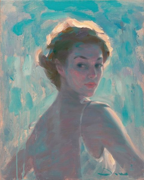 Vincent Xeus created this oil painting, "Goldilocks," using traditional fine art materials. The loose brushstrokes are a vital part of this painting. Notice how the artist coaxes the face and the shoulders into view, out of a background of blurred blues and greys. The paint has been applied with visible energy. Look at the background and you can see vertical marks that emphasize the material qualities of the paint: its viscosity, its texture, and its capacity to be pushed around the canvas. Oil paint, despite its association with high art, is a very labor-intensive material. Pigments have to be carefully ground and mixed with oil, a process that would have historically involved many studio assistants. And even when the paint is ready, it takes a real mastery of brushwork to achieve effects like this. Considering the artist's careful application of paint and brushwork, we appreciate how skill and technique can imbue an artwork with a specific kind of beauty.