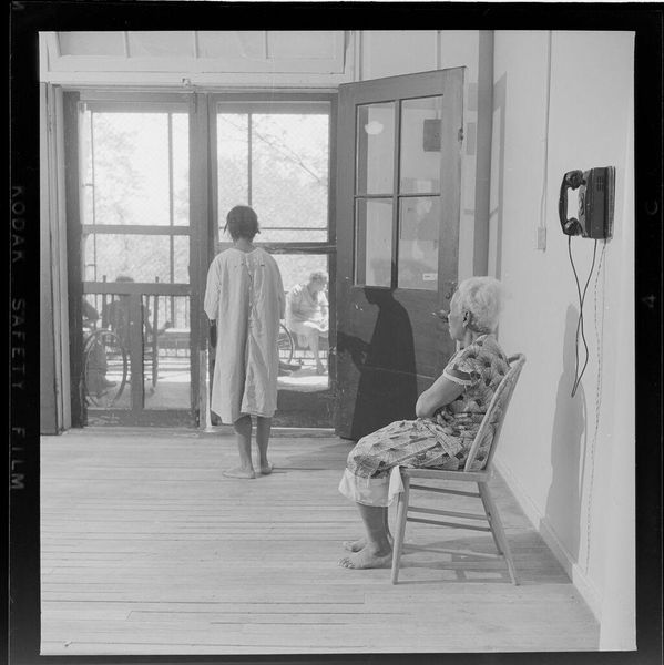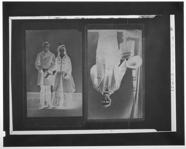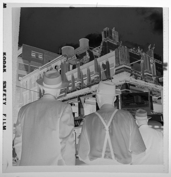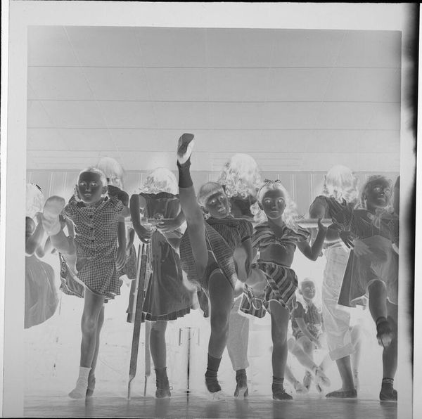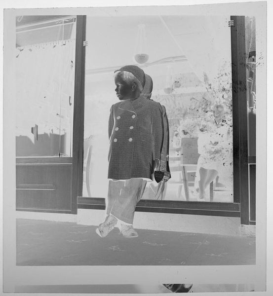 Curator: Jack Gould's "Untitled (girl standing on drain coming out of wall)" presents us with an intriguing, almost surreal scene. The dimensions are quite intimate, just 5.7 x 5.7 cm. Editor: My first impression is one of unease. The inverted tones create a ghostly, dreamlike quality. It's almost unsettling. Curator: It certainly challenges our perceptions. Consider the materials and the process: the chemical manipulation inherent in creating a negative, which would impact the social context of the subjects when revealed. Editor: Absolutely, and the composition itself is quite deliberate. The girl is centered, seemingly levitating above this drain, framed by other figures in the background. Where was this taken, and what was Gould trying to say about social class? Curator: Sadly, we lack much of that contextual information. But what we can see is the play of light and shadow, the transformation of mundane materials into something that carries a considerable weight. Editor: It makes you wonder about the role of the artist, Gould, and how his vision shaped our view of that moment. Curator: Precisely! The photograph becomes a testament to the artist's labor and the power of photographic manipulation. I think the act of capturing and processing this photo is just as important as its content. Editor: A truly thought-provoking piece that pushes us to reconsider our own perspectives.