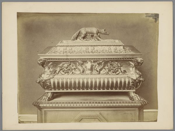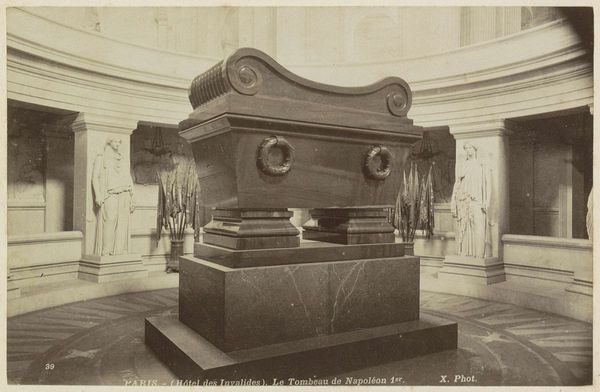 Editor: This is "Graf van Napoleon in de Dôme des Invalides," a photograph taken sometime between 1890 and 1898, credited to L.P. It depicts Napoleon’s tomb. It feels so staged and monumental. What do you see in this piece? Curator: Oh, staged is definitely the word! This photograph captures not just a tomb, but a carefully constructed stage for memory. The grand scale is striking, but to me, it's less about the man himself and more about the myth that France built around him. Did they really need to put 'Moscow' on the floor around his tomb?! Editor: Good point! What’s with the wreaths on the tomb, framing Napoleon like that? Curator: I wonder if they represent both victory and defeat… Laurel wreaths turned to stone, an eternal echo. It is quite something how photography captures that moment, but perhaps more fascinating is how it translates sculpture to image, almost distilling the myth even further! You can sense the weight of history bearing down, can't you? I'd be so curious to feel that space. What do you think about this space that seems so imposing yet also strangely silent? Editor: Yeah, absolutely, there's this stillness despite all the visual pomp. Maybe it's the black and white; the limited palette quiets the grandeur somehow. I guess it invites you to reflect, to meditate on power and legacy, in a way a brightly colored painting might not. Curator: Precisely. It makes one think about who controls the narrative. Even in death, Napoleon is being presented to us in a very particular way. It leaves you questioning, doesn’t it? Editor: Definitely. Thanks! I’m glad to get your insights on it; I didn’t see half of that initially! Curator: It’s a pleasure! It's always a layered experience when the man became the myth.