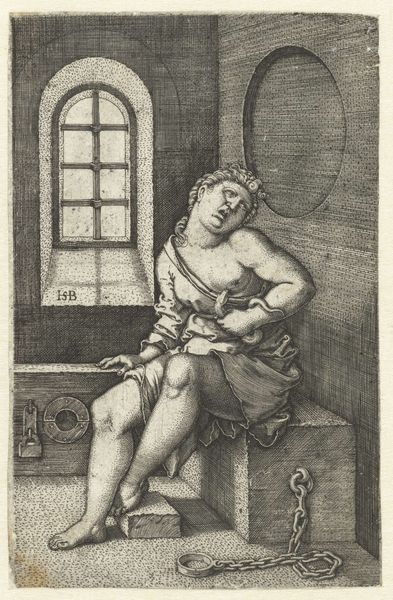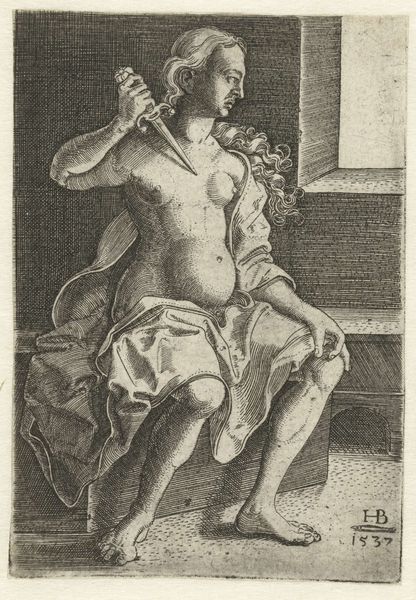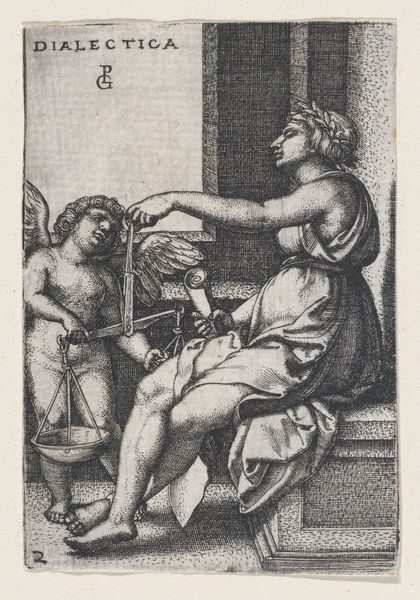 Georg Pencz created this engraving, Retorica, sometime between 1500 and 1550. The composition balances the static form of the seated Rhetoric against the dynamic posture of the cherubic figure holding a book. This tension gives the artwork a sense of restrained energy. The intricate network of etched lines, defining forms and creating subtle tonal variations, reinforces this dynamism. The image presents a complex semiotic interplay. Rhetoric, crowned with laurel, sits in a pose that suggests both authority and contemplation. The book-bearing cherub symbolizes the transmission of knowledge. Pencz uses these established visual codes to comment on the power and responsibility inherent in persuasive communication. He destabilizes a fixed meaning by adding a nuanced interpretation to the classical theme. Note how the formal elements—the contrasting textures, the balanced composition, and the symbolic figures—invite ongoing dialogue, suggesting that the essence of rhetoric lies not in static pronouncements but in continuous interpretation.