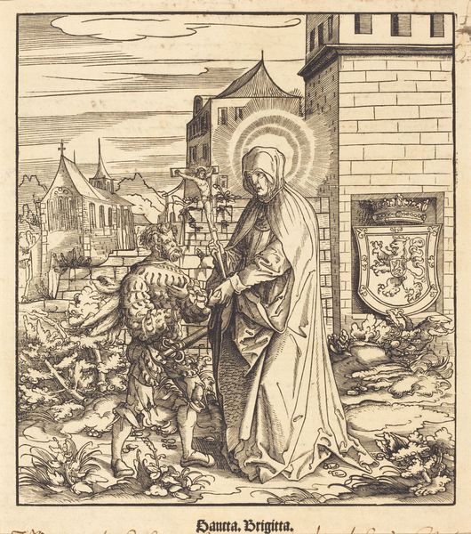 Leonhard Beck's woodcut, "Saint Verona," presents us with a study in contrasts, rendered in stark black lines against a pale ground. The composition centers on the saint's act of charity, set against an elaborate architectural backdrop that recedes into the distance. The linear quality of the woodcut emphasizes form, delineating the heavy folds of Saint Verona’s robes. A halo emanating light surrounds the crown on her head, which she is about to give away. This detailed focus shifts to the figure of a seated beggar in a tattered coat and head covering, his posture mirroring a state of receipt. The architectural elements, while providing context, also serve as a semiotic framework. The lines are not just descriptive, but structural; they define the narrative space and moral allegory. Beck uses line and form to explore themes of sacrifice, humility, and the role of the Church within the social fabric. The artist invites us to consider how symbolic structures reinforce or challenge existing social and religious meanings.