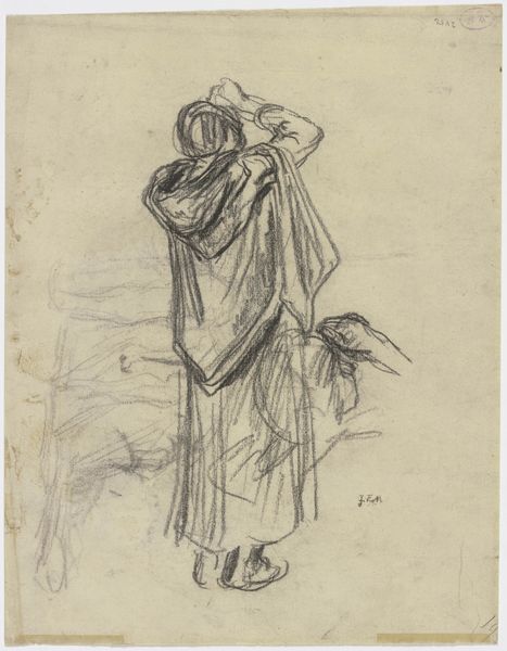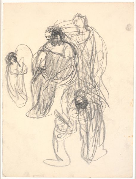 Curator: This drawing, likely created between 1900 and 1905, is by the Swedish artist Karl Isakson. Titled "Jacob Wrestling with the Angel?", it resides here at the SMK, Statens Museum for Kunst. Editor: My initial feeling? A dance on the edge of darkness, almost a violent tenderness. Look at the furious, scribbled lines. You can sense the intense struggle, yet also this strange… intimacy? Curator: Absolutely, it's that charged tension. You see the materiality, the simple graphite on paper allowing for this amazing sense of movement. Isakson wrestled, too, I suspect – with faith, with form – during its creation. You feel like he almost allows the paper's "ground" to define space, like the figures are arising out of material potential, not only rendered in the charcoal's immediate, forceful reality. Editor: And it's just that - charcoal’s reality, on brown paper! The very act of mark-making is visible. The material almost embodies that rawness, it's not refined or pristine; it’s earthy, like the biblical story itself, of labor and persistence. Not to sound too flippant, but does anyone consider this 'work' within the total arc of what made up Isakson's day? The struggle for him and the wrestle for Jacob feel intertwined. Curator: Oh, fascinating! Because I look at it and imagine the wrestling is as much internal as external; is Jacob battling an angel, or himself? You can almost feel the vulnerability beneath all the apparent aggression, don't you think? I suppose, in both respects, you ask yourself as the artist how the toil changes or affects its potential. Editor: Absolutely, but by choosing humble materials—paper, graphite—and foregrounding their use, Isakson's underscoring something beyond any mythic narrative; art making, is a material and earthly process itself and perhaps his way into something spiritual? Curator: Maybe the limitations are the gateway. Like using a limited palette can open a broader emotional range, don’t you find? Well, what a remarkable glimpse this drawing gives us, into faith and artistic creation intertwined! Editor: Right, seeing how physical, how very *present*, a so-called divine wrestling match could be, shown plainly with only paper, pencil, and time!