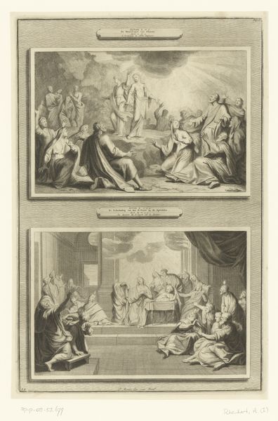 Hendrik Elandt created this print showing the death of Herod Agrippa and Paul striking Barjesus with blindness, sometime before his death in 1705. It's interesting to consider the role of such biblical scenes in Dutch society at this time. The Netherlands was a Protestant nation, but its art market was open to a wide range of interpretations and expressions of faith. This print reflects a complex interplay of religious belief, political power, and social order. The scenes depicted served to reinforce the authority of the church, and also warned against those who might challenge it. In the top panel, the death of Herod Agrippa might be read as a cautionary tale against rulers who were perceived as challenging divine authority. The second image shows Paul striking Barjesus with blindness, demonstrating the power of faith to overcome those who oppose it. Historians of prints and popular culture can help us to understand better how images such as this one operated in the public sphere. They were not simply illustrations but tools for shaping public opinion and reinforcing social norms.