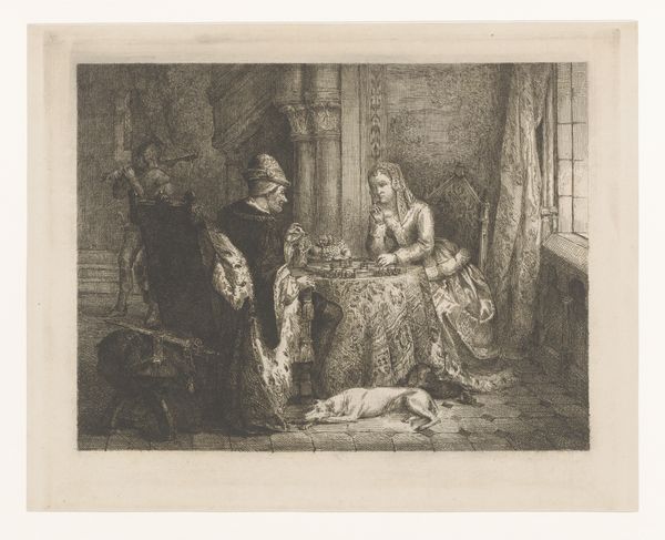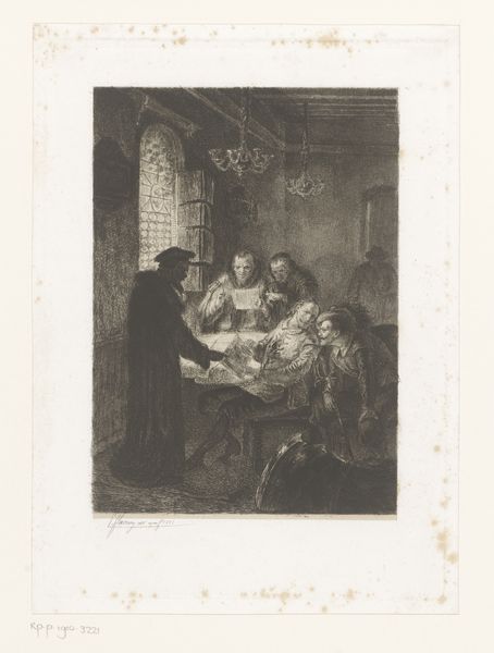 Cornelis Dusart created this print called ‘The Face’ sometime between 1660 and 1704. It depicts a tavern scene, a popular subject in Dutch Golden Age art, reflecting the daily lives of ordinary people. In this lively gathering, we see class distinctions subtly portrayed through dress and demeanor. The woman with the elaborate hairstyle and relatively cleaner attire contrasts with the disheveled men, suggesting varying social positions within the working class. Gender dynamics are also at play, as the woman seems to hold a position of power or authority, indicated by her posture and the way she holds the candle, illuminating the scene. The men’s exaggerated expressions and gestures evoke a sense of humor, but also perhaps a commentary on the excesses and moral ambiguities associated with tavern culture. Dusart invites us to reflect on the complexities of human interaction. The artwork captures a moment of shared experience while hinting at broader societal issues related to class, gender and morality.