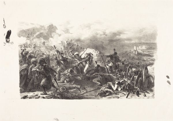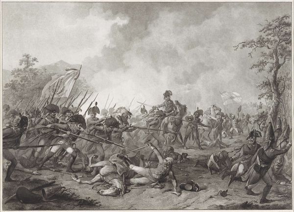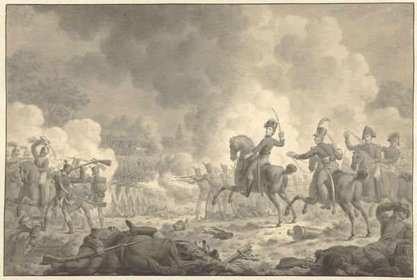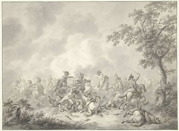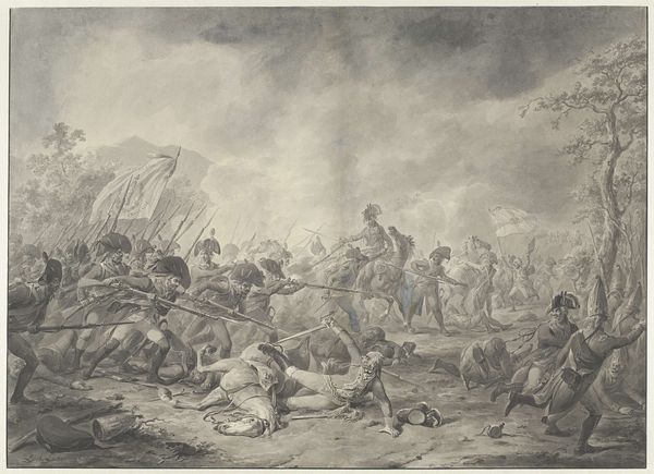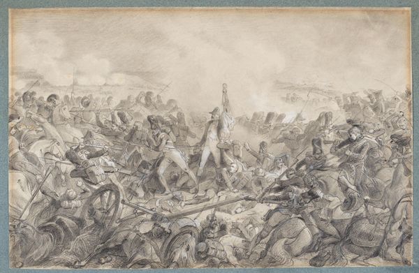 Curator: This compelling drawing is titled "Gevecht bij een dorp", or "Fight near a Village," created by Dirk Langendijk in 1805. It resides here at the Rijksmuseum and employs charcoal as its medium. Editor: The scene hits you immediately, doesn’t it? It's chaos rendered in muted tones, a frenetic energy barely contained within the frame. A swirl of combat, all grays and whites—almost dreamlike in its detachment, yet viscerally violent. Curator: Langendijk was well-known for his depictions of battles and military scenes. What's interesting here is the blend of romanticism and nascent realism, showing both the grand sweep of conflict and its brutal, personal impact. The rise of national sentiment and warfare dominated imagery in that era. Editor: And it's impossible to ignore that this 'grand sweep' is largely romanticizing violence, isn’t it? How does this narrative-art engage, or perhaps disengage, from the human cost? The village in the background seems almost indifferent. Curator: I think that detachment speaks volumes. The late 18th and early 19th centuries were times of revolution and upheaval, these grand narratives, were a way for the powerful to reassert a specific social and moral order. Editor: Look how bodies are contorted, nearly piled on top of each other. Langendijk has clearly mastered technique but perhaps that craft works to amplify the romantic ideal of power instead of calling into question whose stories get to be told, how war serves very particular interests, and at what cost. Curator: I agree. But there is an interesting tension in its use of charcoal. He presents the scale and sweep of armies in battle with something you would use for an intimate portrait. Editor: And yet that intimacy never extends to the victims, does it? Whose stories and experiences are flattened for this particular “grand narrative?" That’s the question I’m left with. Curator: Precisely. This piece reflects how institutions upheld hierarchies in history by shaping our perspective. Editor: Right, which is a good reason why art prompts us to question what’s centered, what’s not, and why these representations persist.