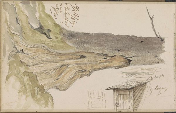 Editor: This is Andreas Schelfhout's "Boomstam," made around 1811, using pencil and watercolor on paper. It's at the Rijksmuseum. It has such a fragile, transient feel, almost like capturing a fleeting thought. What do you see in this piece? Curator: I see a relic. This isn't simply a tree trunk; it's a fragment, burdened with time. Note how the broken end almost resembles a grasping hand. The single, lonely form in a mostly empty space becomes a symbol, a *memento mori* perhaps, a reflection on mortality itself. How do those implications resonate in our modern culture saturated with images of decay and entropy? Editor: That's interesting, because I didn't initially see the decay, more just…simplicity. So the negative space around the trunk, you're saying it's crucial to the image's meaning? Curator: Absolutely. Consider this during the Romantic era – nature wasn't just a backdrop. It mirrored the internal landscape of the soul. The starkness isolates this trunk and forces contemplation. It begs questions. What stories could this fallen fragment tell if it could speak? What cultural associations would audiences bring to it? Editor: So it’s not just a dead tree; it embodies themes relevant to the Romantic period, filtered through history and the associations an audience carries. Curator: Precisely. Its enduring presence connects to our present examination of nature. Its simplicity offers lessons. How often do we disregard simple fragments, symbols loaded with the echoes of past and future? Editor: I guess I didn't appreciate how much an image of a simple thing like a fallen branch can mean. Thanks! Curator: Indeed. Seeing significance in what appears ordinary – that's the magic images give to us.