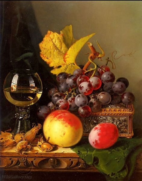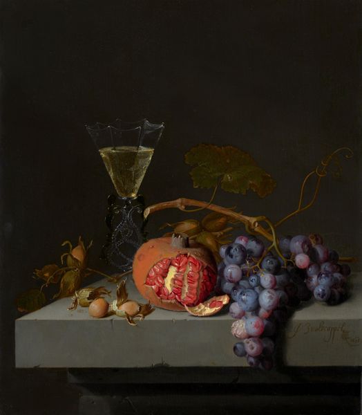 Curator: Milne Ramsey painted this still life, "Marble Tabletop with Fruit and Wineglass," in 1869. It's oil on canvas. Editor: It feels opulent, yet quiet. That gleaming marble, the ripe fruit... almost too perfect, like a stage set. Curator: Still life as a genre often carried symbolic weight. Think of the Dutch masters—each object carefully chosen to represent mortality, wealth, or even fleeting pleasures. Editor: So, peaches equal...what, juicy secrets? And those grapes look ready to burst. There’s a fly crawling over one! It makes it… real, somehow. Takes the edge off the perfection. Curator: That detail underscores an interesting tension present in still life traditions: the desire to preserve beauty versus the acknowledgement of its transience. In the 19th century, Academic art prized a certain degree of realism, while continuing to draw from those Baroque themes you mentioned. Editor: Absolutely. It is as if it were saying 'Enjoy this, but don't forget nothing lasts.' What strikes me is how modern it feels, somehow. That clean marble against the dark backdrop, the way the light catches the glass…it could be a contemporary photo. Curator: Perhaps it’s the realism. Ramsey trained within artistic conventions, emphasizing technical skill and illusionism. That undoubtedly helped transcend its time. Though remember, even "realism" is constructed—it's a particular way of seeing and representing the world, shaped by social and cultural values. The middle class desire to show off their goods with painting like this... Editor: True. There's an aspirational quality to it, isn't there? It's beautiful but slightly manufactured; there's a fly and decaying piece to add authenticity to the composition. And I love that it keeps us guessing – perfection, reality, memento mori. That hum of meaning buzzing under the surface. Curator: A perfect treat to end our tour. Editor: To fruitful interpretations!