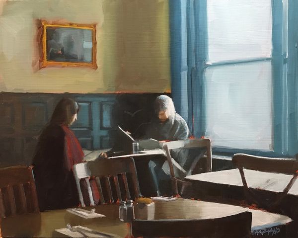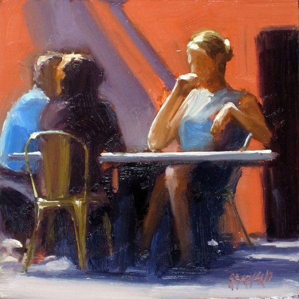 Dan Graziano's "Dining Alone" captures a solitary figure, bathed in the interplay of light and shadow, a scene rich with symbolic resonance. The woman's downcast gaze speaks volumes, a posture reminiscent of melancholic figures in Renaissance art, suggesting introspection or sorrow. This motif of solitude, of being alone, carries echoes of the medieval "danse macabre," reminding us of our shared human condition. The bar setting, typically a place of conviviality, here amplifies the woman's isolation. The bottles on the counter become stand-ins for absent companions, their red hue perhaps symbolizing suppressed passion or unacknowledged pain. Note how the light from the window casts a shadow on the counter, almost swallowing the space ahead, creating a powerful visual metaphor for the psychological weight she carries. Such symbols recur throughout art history, constantly evolving yet fundamentally unchanged, speaking to our collective unconscious and stirring profound, often unspoken emotions.