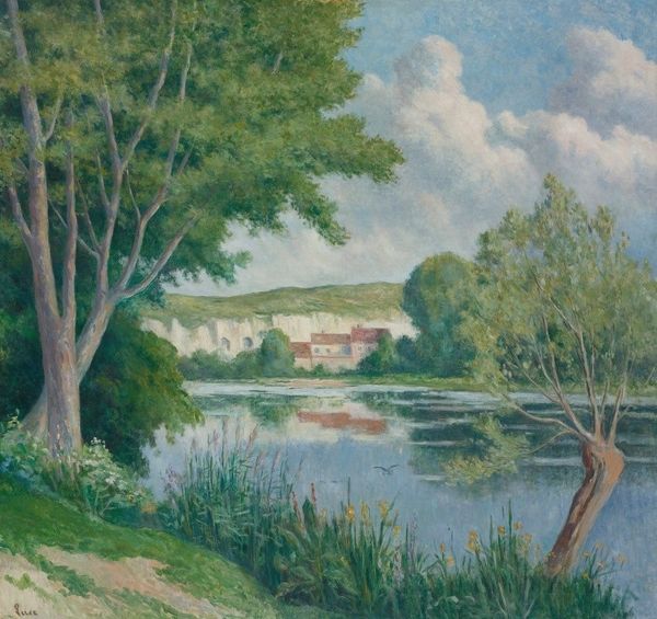 Editor: This is "Bank of Oise" by Hippolyte Petitjean, likely an oil painting. It's just so…peaceful. The way the light filters through the trees and reflects on the water is captivating. What stands out to you, and how do you interpret this work? Curator: I see a powerful invocation of cultural memory. Rivers often represent the passage of time, don't they? And in this context, consider the Oise. It was strategically vital through centuries of conflict. Petitjean uses this placid scene to perhaps subtly acknowledge this layered history. Does the vibrant foliage evoke a sense of hope to you? Editor: Yes, absolutely. There is almost something fairytale-like, innocent to the scenery. Do you think the boating person adds a touch of… longing perhaps? Curator: Exactly! That figure embodies humanity’s relationship with nature. The very small figure speaks to our fleeting moment on Earth and our innate need to co-exist harmoniously within our landscapes. How do the reflections influence the overall impression? Editor: It seems the doubling, the upside down mirroring, amplifies the peaceful quality of the piece. Maybe, doubling the present to secure this memory for a bit longer. Curator: Precisely! It anchors this memory. And note the bridge in the background - the meeting between nature and development; the connection point is literally suspended in the sky. The artist asks you to look more intently at that which you often gloss over. Editor: I never would have considered all that on my own! I was stuck on just the pretty colors. Curator: Art invites us to dig deeper. The pretty colors draw you in so that you ask more of it, consider its deeper symbolism.